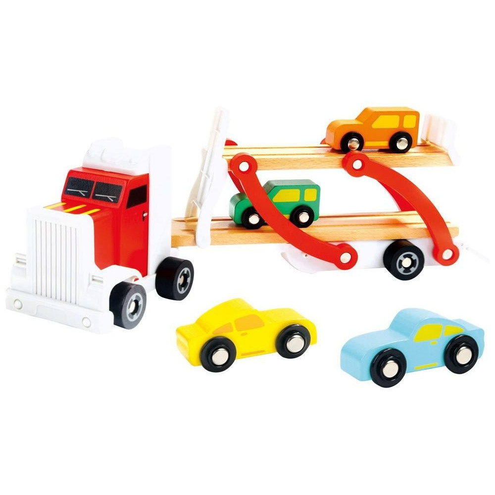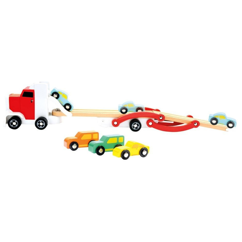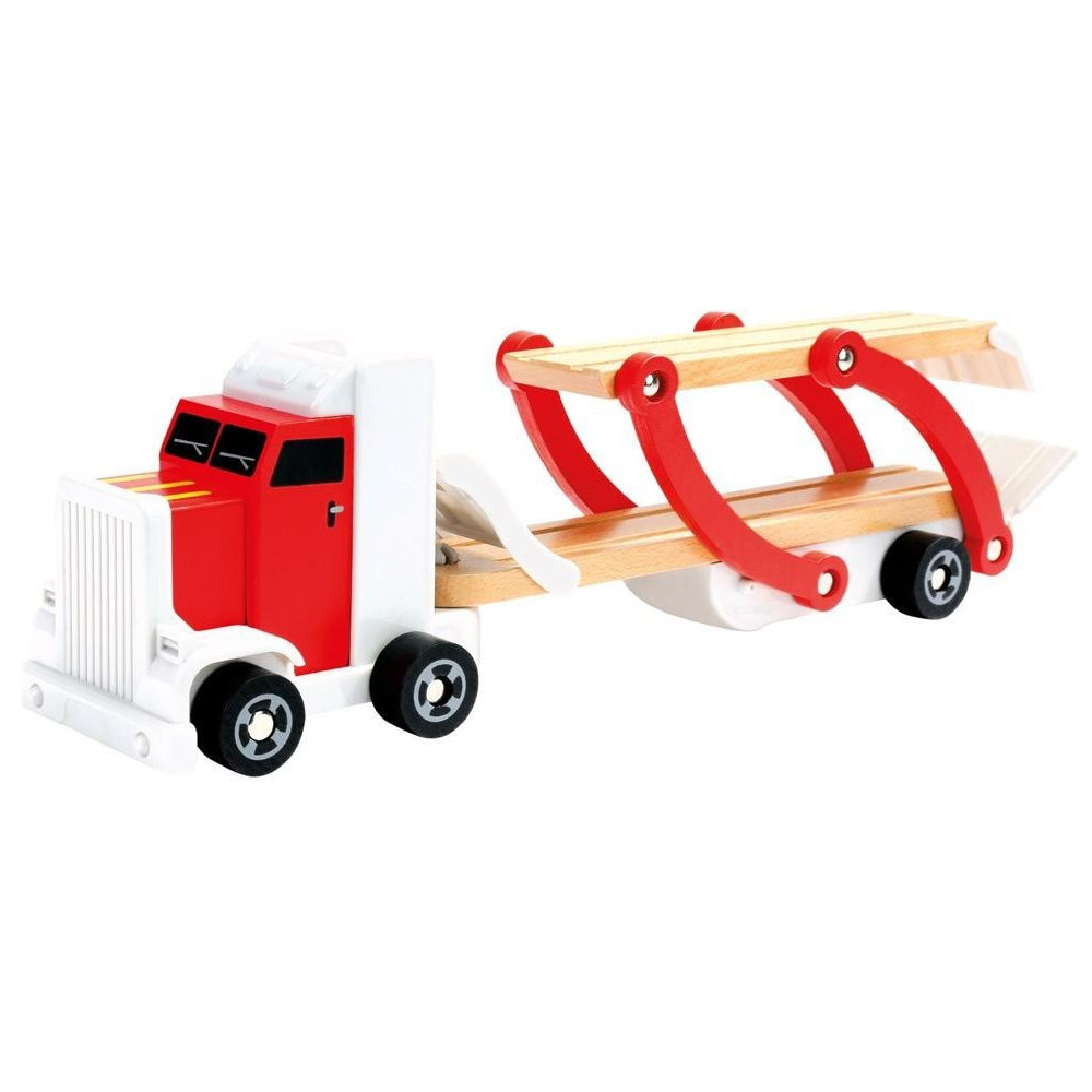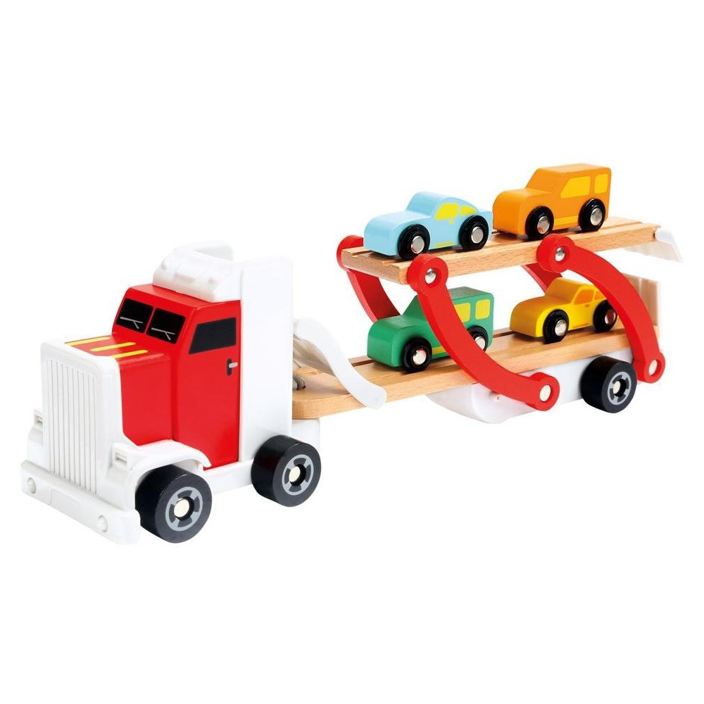 Dřevěný tahač s auty na dvoupatrovém návěsu, který se dá naklápět tak, aby auta mohla sjíždět a vyjíždět. Návěs se dá odpojit. Hračka, se kterou si vyhraje každý kluk. Balení obsahuje tahač a 4 auta. BINO Europe je nadnárodní firma vyrábějící zejména dřevěné hračky pro děti. Výrobky ze dřeva pod obchodní značkou BINO jsou vyráběny v České republice v Klatovech (dříve pod názvem Olymp Klatovy), jsou vyváženy do celého světa a veškeré hračky mají zdravotní atest, tím splňují všechny normy EU. Firma se zabývá výrobou veškerých druhů dřevěných hraček, mezi velmi oblíbené patří například různé dráhy, obrázkové puzzle, ale taky třeba dětské hudební nástroje. BINO používá oblíbené pohádkové a večerníčkové motivy, které si zamiluje každé dítě.