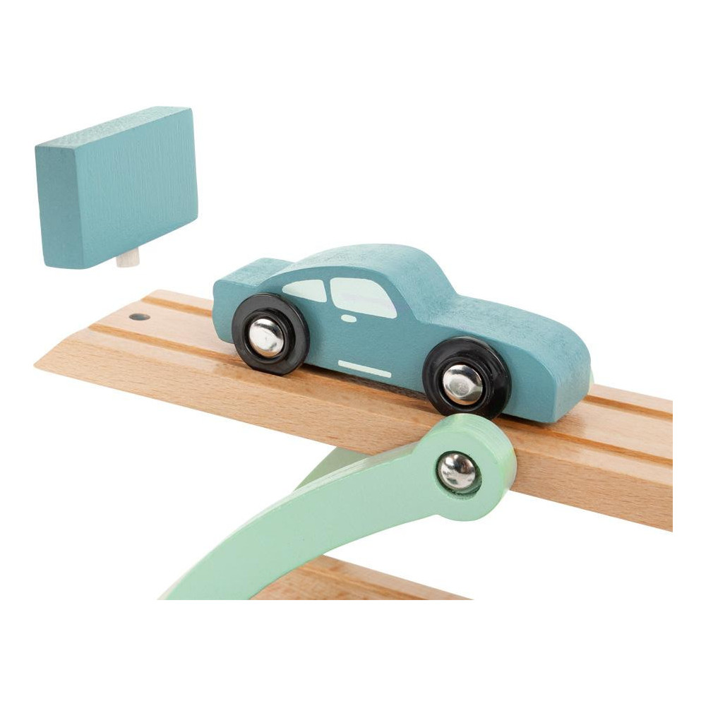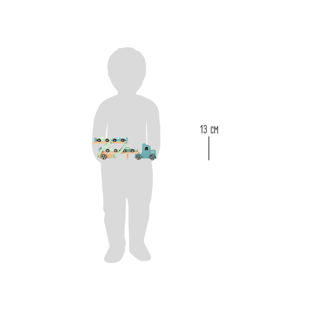 Velká kola jedou! Tento kamión s návěsem na automobil vychází z velkých mezikontinentálních kamionů a inspiruje barevným schématem „modré oceli“. Transportér je kompletně vyroben z přírodního dřeva. Díky tomu je ideální pro dlouhodobý herní zážitek. Dva ze čtyř turborychlých sportovních vozů se jednoduše naloží na sklopnou horní palubu - to zajistí nakládací rampa. Skvělý transportér automobilů, který by neměl chybět v žádném dětském pokoji.