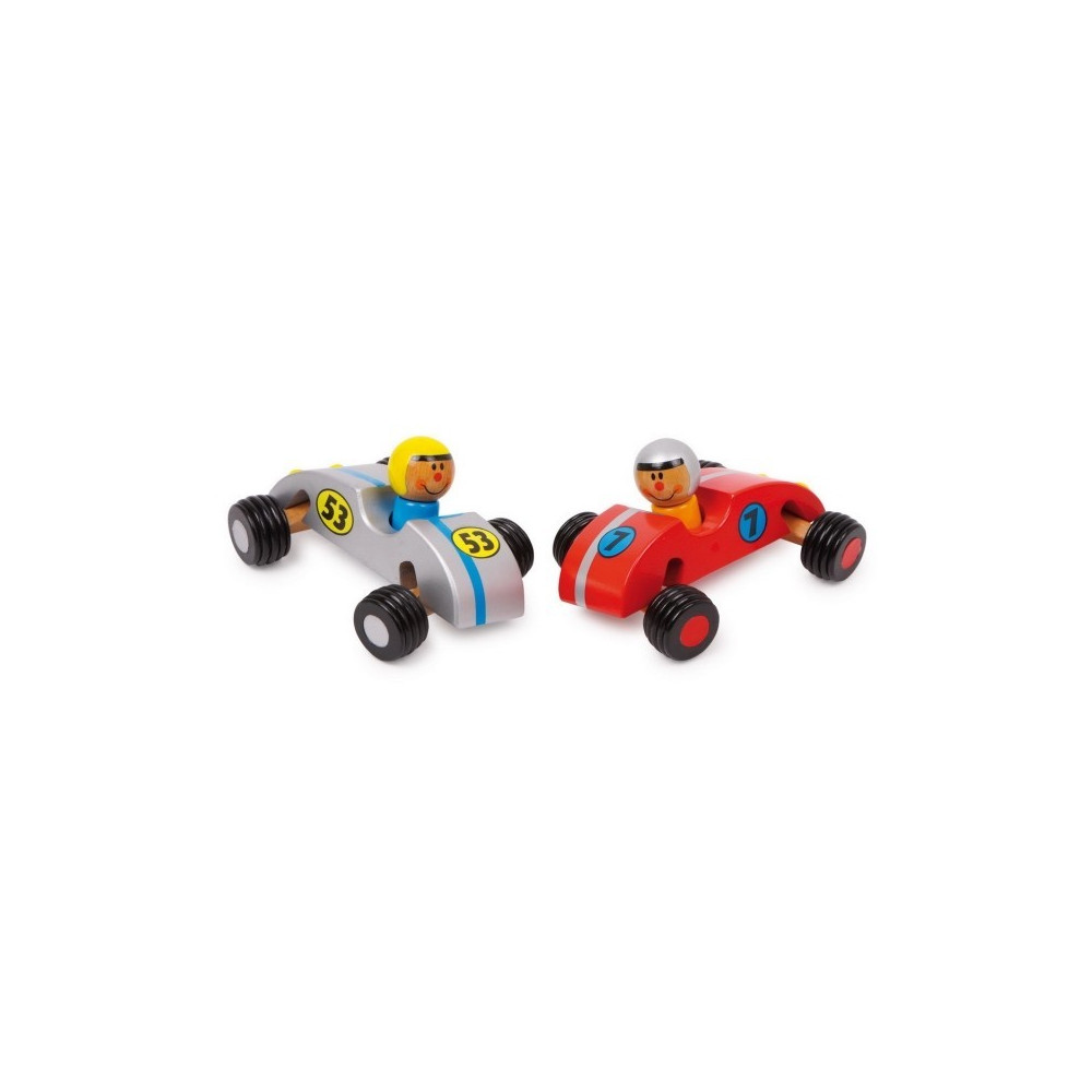 Sada 2 ks. Tito veselí piloti a jejich rychlá vozidla jsou vyrobeni ze stabilního dřeva. Pohyblivé osy umožňují motoricky zručným dětským rukám provádět s barevně nalakovanými autíčky i razantní jízdy.