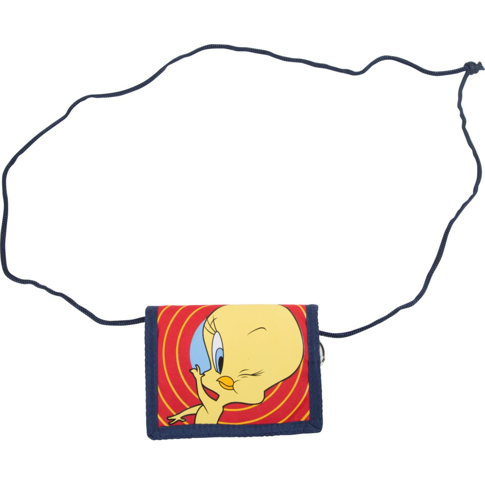 Tweety a Sylvester na krásné textilní peněžence. Děti si do ní mohou uložit kapesné nebo peníze na svačinu. Díky kroužku si ji snadno připevní ke kalhotám, aby ji neztratili. Peněženka má také provázek kolem krku.