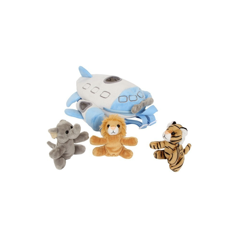 S batohem z měkkého, odolného textilu se zipem prožijí děti cestováni jak v letu. 3 měkcí a přítulní cestující – lev, slon a tygr (cca 11 x 7 x 11 cm) jsou skvělými společníky na hrání, spaní a mazlení! V batohu je prostor i pro další věci. Popruhy z nylonu jsou nastavitelné a zadní strana vycpaná pro pohodlné nošení.