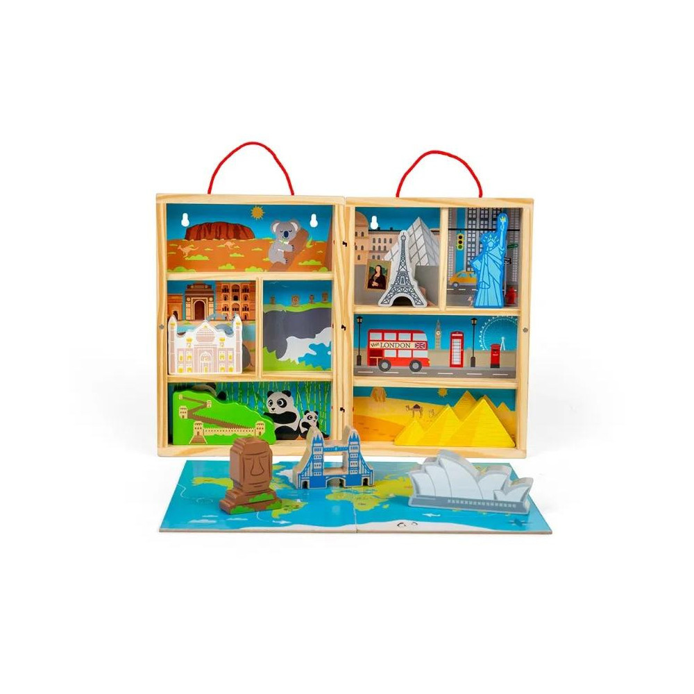 Malí cestovatelé mohou objevovat celý svět z pohodlí domova! Sada obsahuje nejznámější destinace a slavné památky od egyptských pyramid a Velké čínské zdi po australskou operu v Sydney a londýnský Tower Bridge a rozkládací mapu, kterou lze po skončení hry uložit do magnetické krabičky s uchy pro snadné přenášení. Díky tomuto praktickému balení je vhodná i na cesty. Je vyrobena z prvotřídního a udržitelného dřeva s certifikací FSC® a nabarvena netoxickými barvami a laky. Splňuje aktuální evropské bezpečnostní normy.