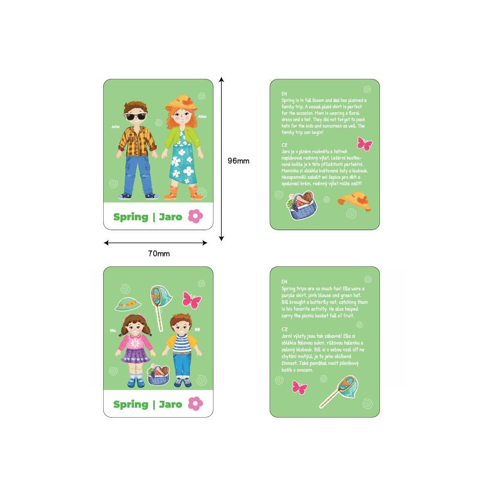 - 8 oboustranných kartiček s příběhy v češtině a angličtině (jaro, léto atd.)