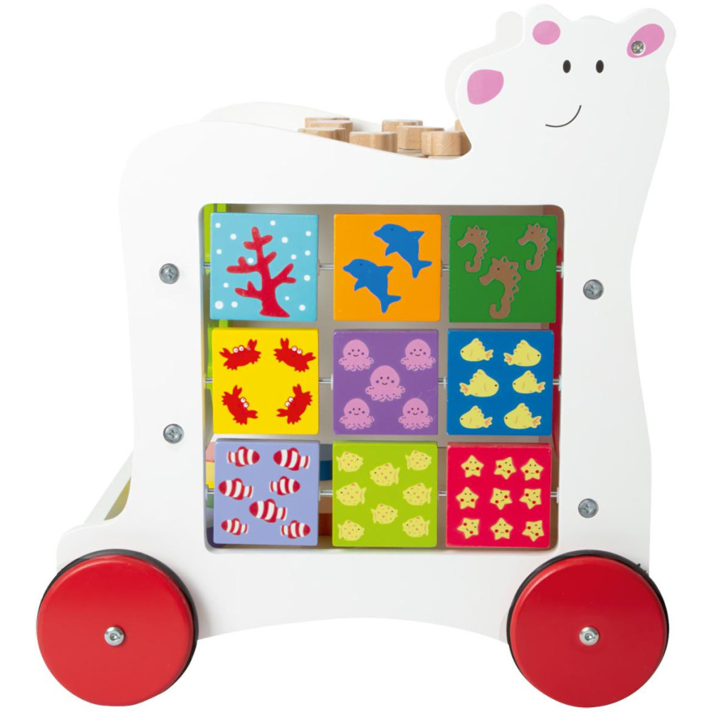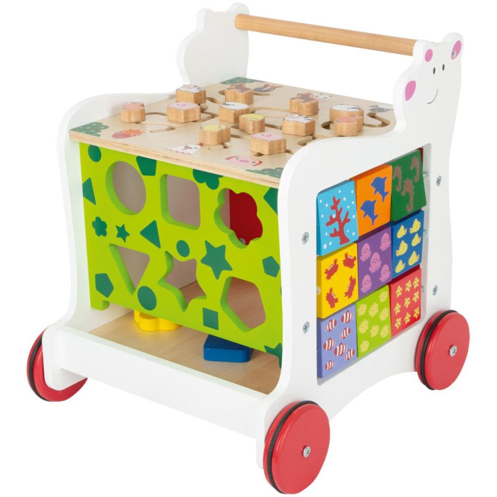 S medvídkem vždy po boku! Multifunkční chodítko dětem nabízí oporu při objevování světa a procvičování různých dovedností. S jeho pomocí lze rozvíjet hrubou i jemnou motoriku, rozpoznávání barev, tvarů a díky tabulce i kreslení a psaní. S motivem medvídka se hravě stane užitečným kamarádem na cestách dětským pokojíčkem. Nabízí praktický úložný prostor, je stabilní a pogumovaná kolečka zajišťují kultivovaný tichý chod na všech druzích povrchů. Chodítko je zhotoveno z kombinace silné a odolné překližky s masivním dřevem. Výrobek vyžaduje montáž, dodáváno s obrázkovým návodem k sestavení.