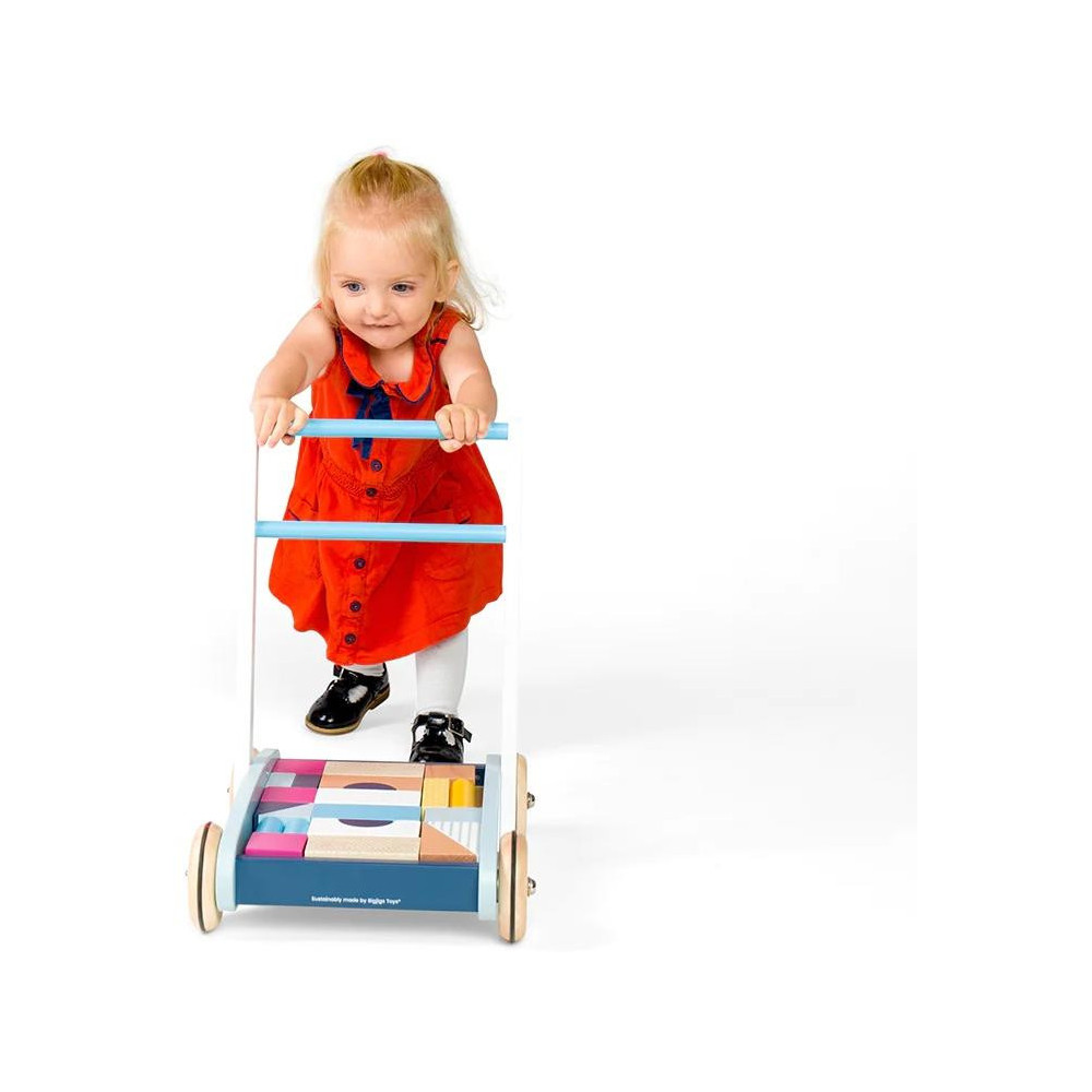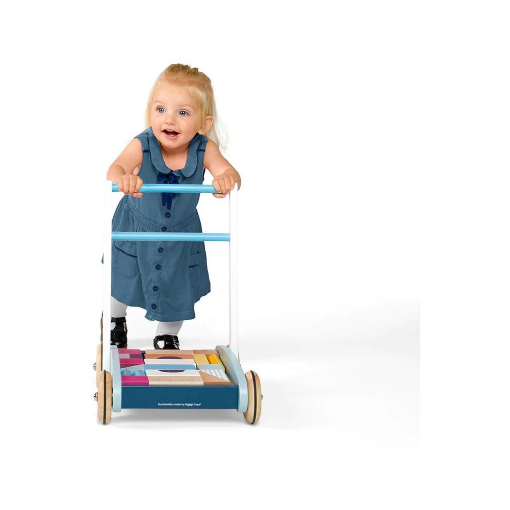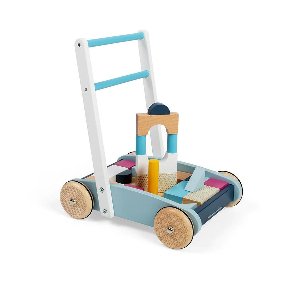 Toto chodítko v pastelových barvách potěší každé dítě. Je ideální pro děti, které teprve začínají chodit. Je vyrobeno z prvotřídního udržitelného dřeva s certifikací FSC® a malováno netoxickými barvami a laky. Chodítko má pevnou dřevěnou konstrukci a snadno uchopitelné madlo, díky kterému se děti cítí sebejistě a v bezpečí. Zábava nekončí, když už mají děti dost procházek, mohou si začít hrát a stavět. Součástí chodítka jsou kostky všech různých tvarů, barev a velikostí. Chodítko je multifunkční a ideální pro rozvoj dětské rovnováhy, motoriky, koordinace ruka-oko, zlepšení znalostí tvarů a rozpoznávání barev. Tvary mají velikost tak akorát, aby se úhledně vešly do dřevěného vozíku. Mají také jedinečné vzory, které upoutají pozornost Vašich dětí. Ideální hračka pro metodu Montessori. Splňuje aktuální evropské bezpečnostní normy.