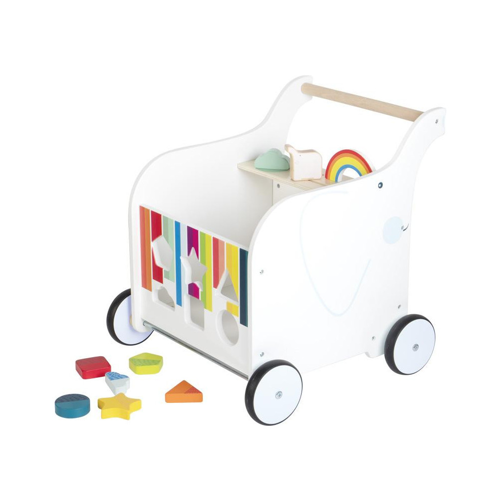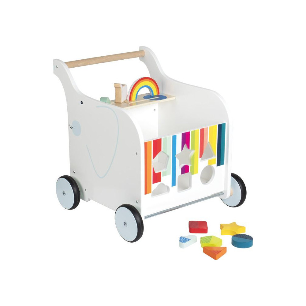 Toto chodítko je inovativní hračka navržená pro malé objevitele, kteří právě začínají svou cestu objevování světa kolem sebe. Duha a její barvy jsou krásným designovým prvkem slona. Multifunkční hračka kombinuje prvky podporující chůzi a praktického úložného prostoru na hračky. Chodítko je vybaveno pevným a bezpečným úchytem pro malé dětské ruce, což umožňuje dětem postavit se a podporuje první krůčky. V těle hračky je dostatek prostoru pro uložení oblíbených hraček. Vkládání šesti různých tvarů a posouvání posuvných dílků trénuje jemnou motoriku dětí zábavnou formou. Pogumovaná kolečka a integrovaná osa zajistí bezpečnou, stabilní a tichou jízdu.