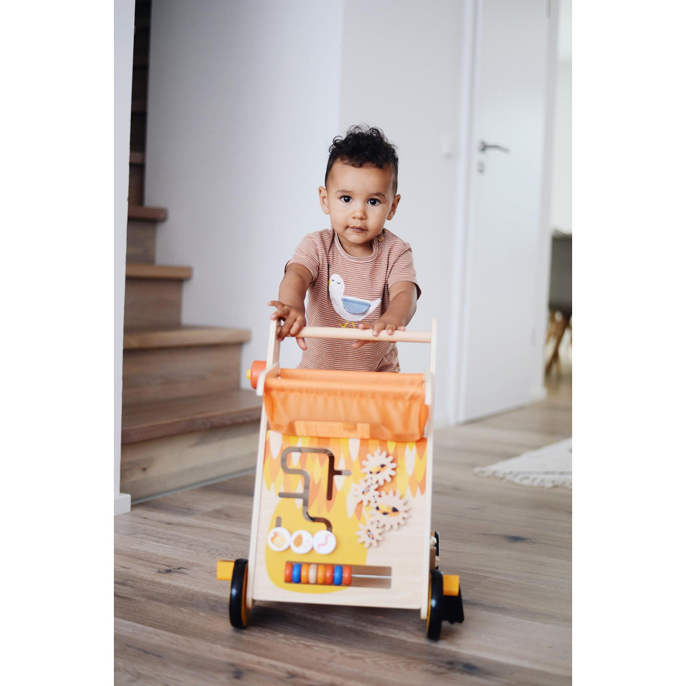 To je ale krásný ptáček! Nevšední dětské chodítko tukan dětem nabídne hru i zábavu v jednom. Chodítko nabízí různé aktivity na 3 stranách, například vkládačku, počítadlo, posuvný labyrint, ozubená kolečka... Podpoří děti při chůzi a také potrénuje jejich jemnou motoriku. „Zobák“ a spodní část chodítka nabízejí úložný prostor pro dřevěné kostky či jiné hračky. Tukan má na předních kolech „nožičky“, které při pohybu vydávají vtipný zvuk. Pogumovaná kolečka také zajištují tichý chod po pevných podlahách. Chodítko je dřevěné a má krásný design. Textilii košíku můžete umýt vlhkým hadrem nebo vyprat. Je praktickým společníkem pro první krůčky, který svým atraktivním a exotickým designem dělá dojem na malé i velké. Hlavní vlastnosti: Obzvláště stabilní, díky robustní konstrukci a trojúhelníkovému tvaru Pogumovaná kola pro tiché a bezpečné ježděníDalší možnosti hraní s dřevěnými vkládacími kostkami , herními prvky, klaksonem, labyrintem a ozubenými koly Klapající nožičky vydávají při jízdě vtipné zvuky Zobák a spodní díl mohou být také praktické úložné prostory Úložný koš (zobák) je vyroben ze snadno udržovatelné a čistitelné látky