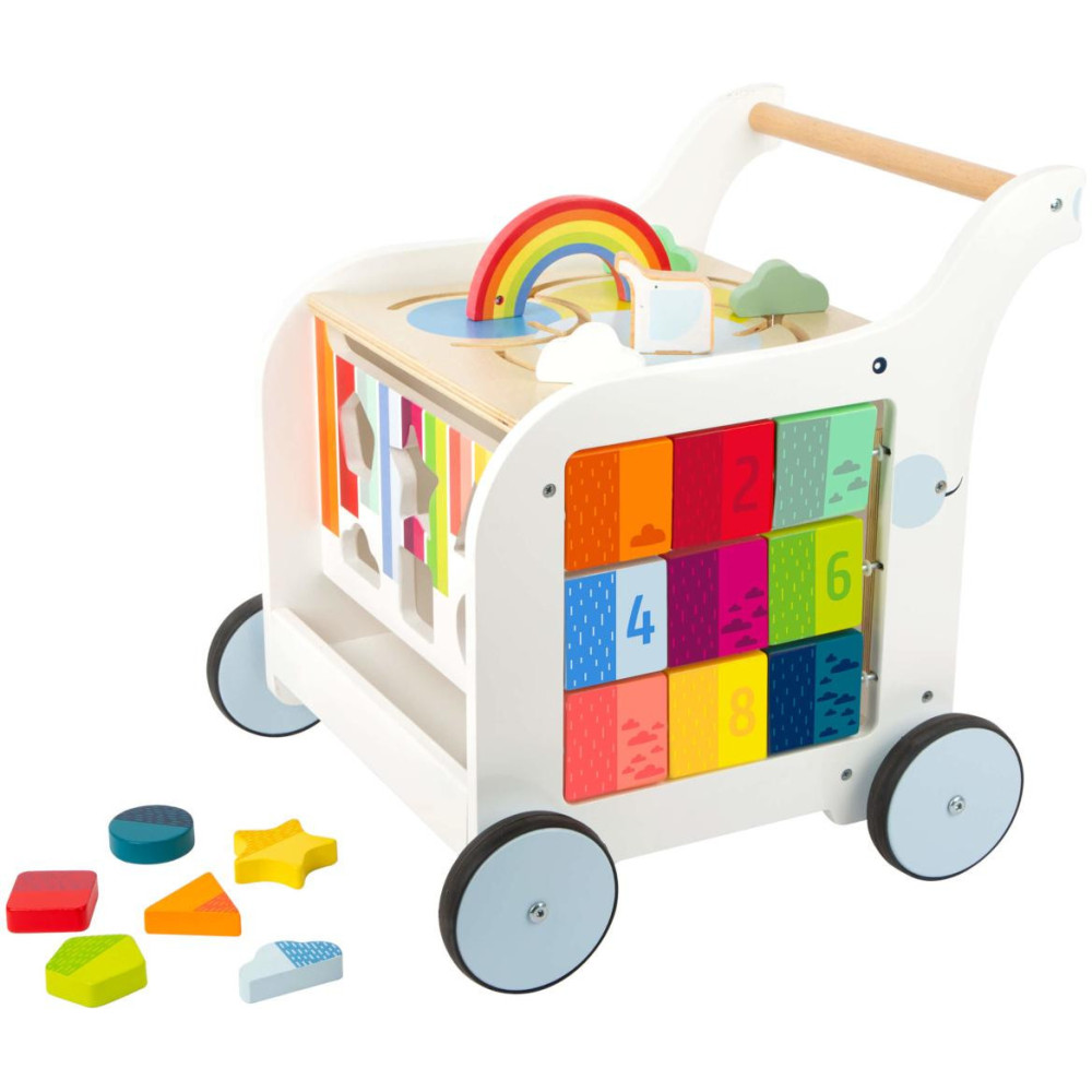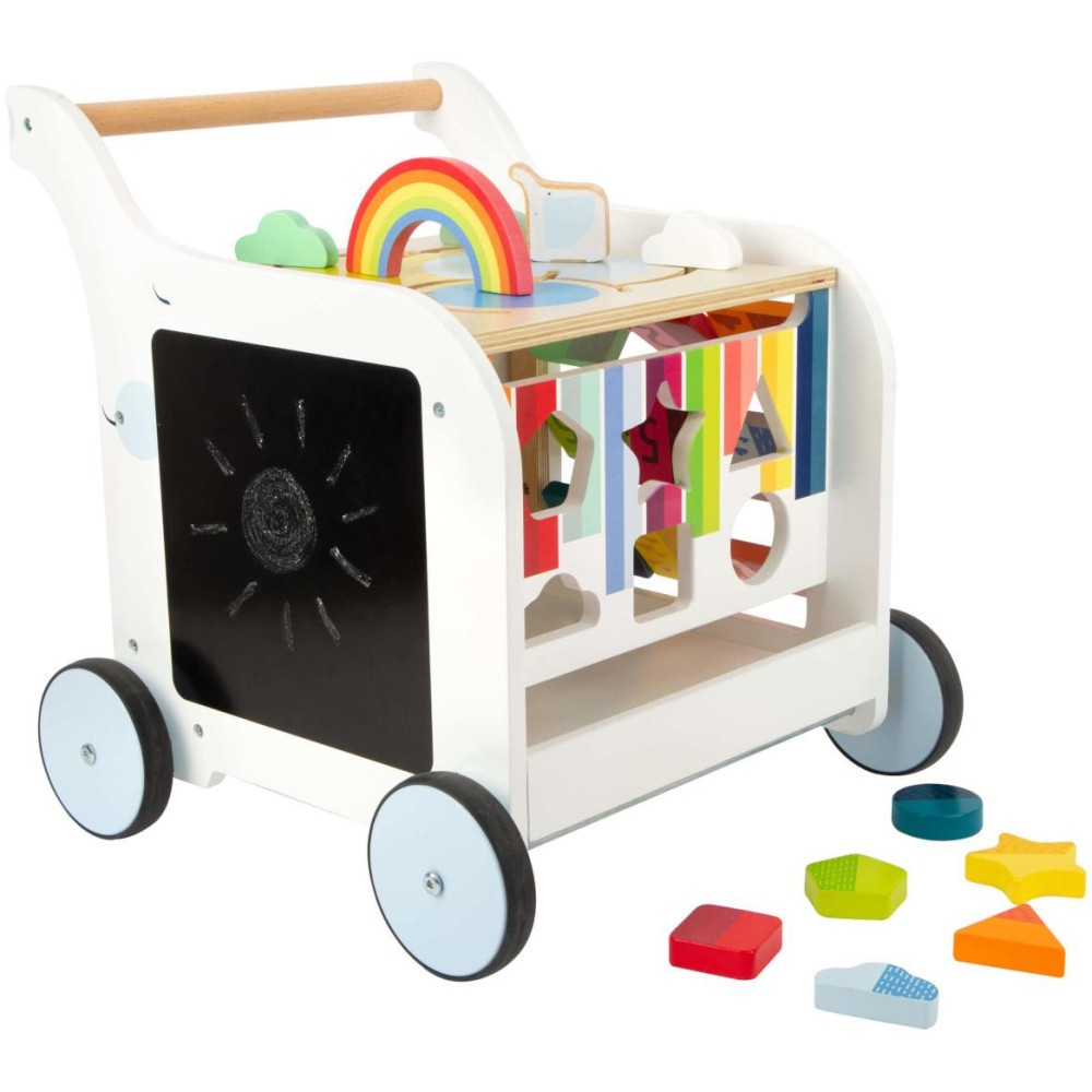 Chodítko ve tvaru slona je multifunkčním doplnkěm pro hru i výuku, přináší zábavu na všech svých pěti stranách! Děti se mohou zabavit duhovým labyrintem, vkládačkou s různými tvary, kreslením na tabulku, nebo otáčením a odklápěním různobarevných prvků. Svrchní desku s labyrintem lze odklápět, je vybavená výřezy bránícími skřípnutí dětských prstů. Odklopením odhalíte objemný úložný prostor na hračky, nebo oblíbeného plyšáka. Kola vozítka jsou opatřena pogumováním, které zajišťuje kultivovaný, tichý chod na všech typech povrchů. Jsou také vybavena brzdou, kterou můžete seřídit rychlost a oporu dle věku a pohybových schopností Vašich dětí. Výrobek vyžaduje montáž, dodáváno s obrázkovým návodem k sestavení. Hlavní vlastnosti: multifunkční chodítko a 6 dílků vkládačkyvkládačka, bludiště, otáčivé kostky, odklápěcí trojúhelník a tabulka pro kreslení křídoupraktický úložný prostortichý chododolné dřevěné provedení