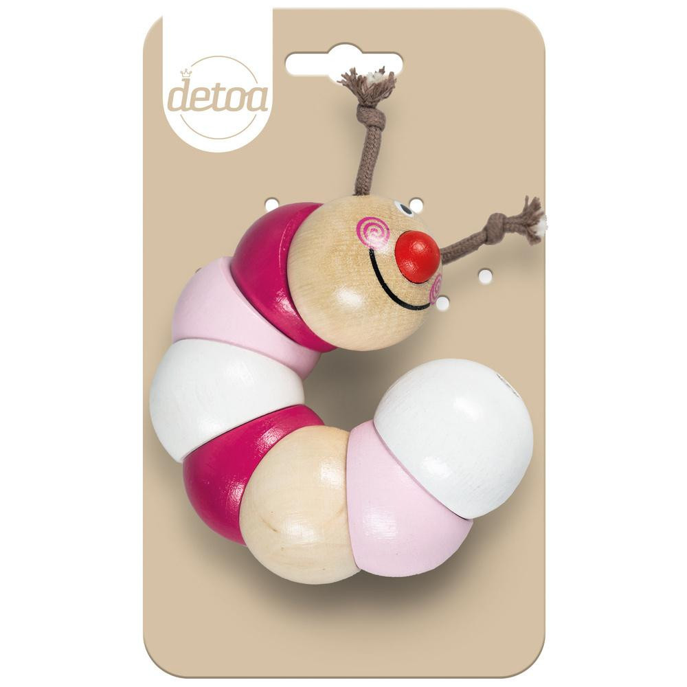 Hračka z barevných dřevěných tvarů navlečených na gumě, které se pohybují, točí a ohýbají. Délka housenky je 13 cm a je připevněna na papírové kartě. Vhodná k procvičování jemné motoriky rukou Vašich dětí již od 6ti měsíců.