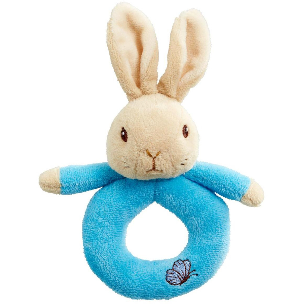 Super měkké chrastítko s králíčkem Petrem a Flopsym z příběhu Beatrix Potter. Perfektní první hračka pro děti. Má velikost tak akorát pro dětské ruce a procvičí smysly dětí. Králíček Petr je modrý, Flopsy je růžový, oba jsou plyšoví a mají na části kroužku výšivaného motýlka. Vhodné již od narození.