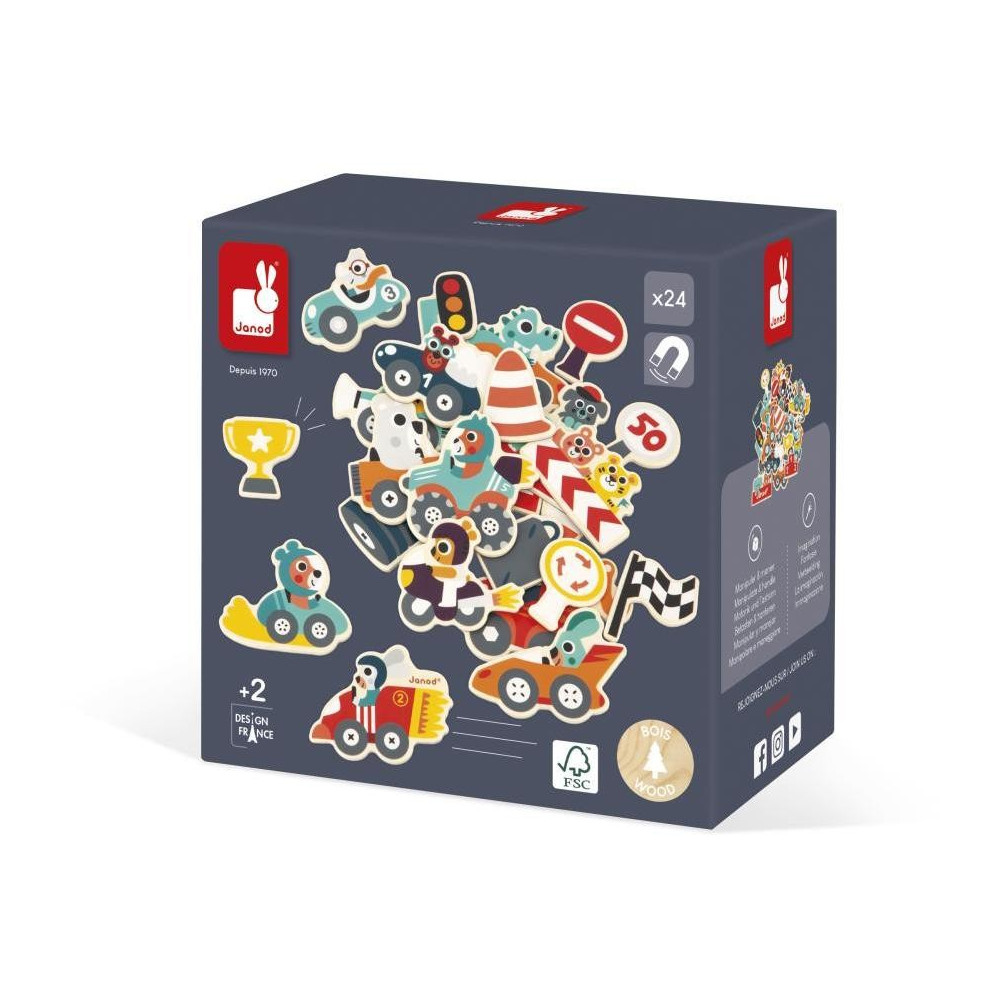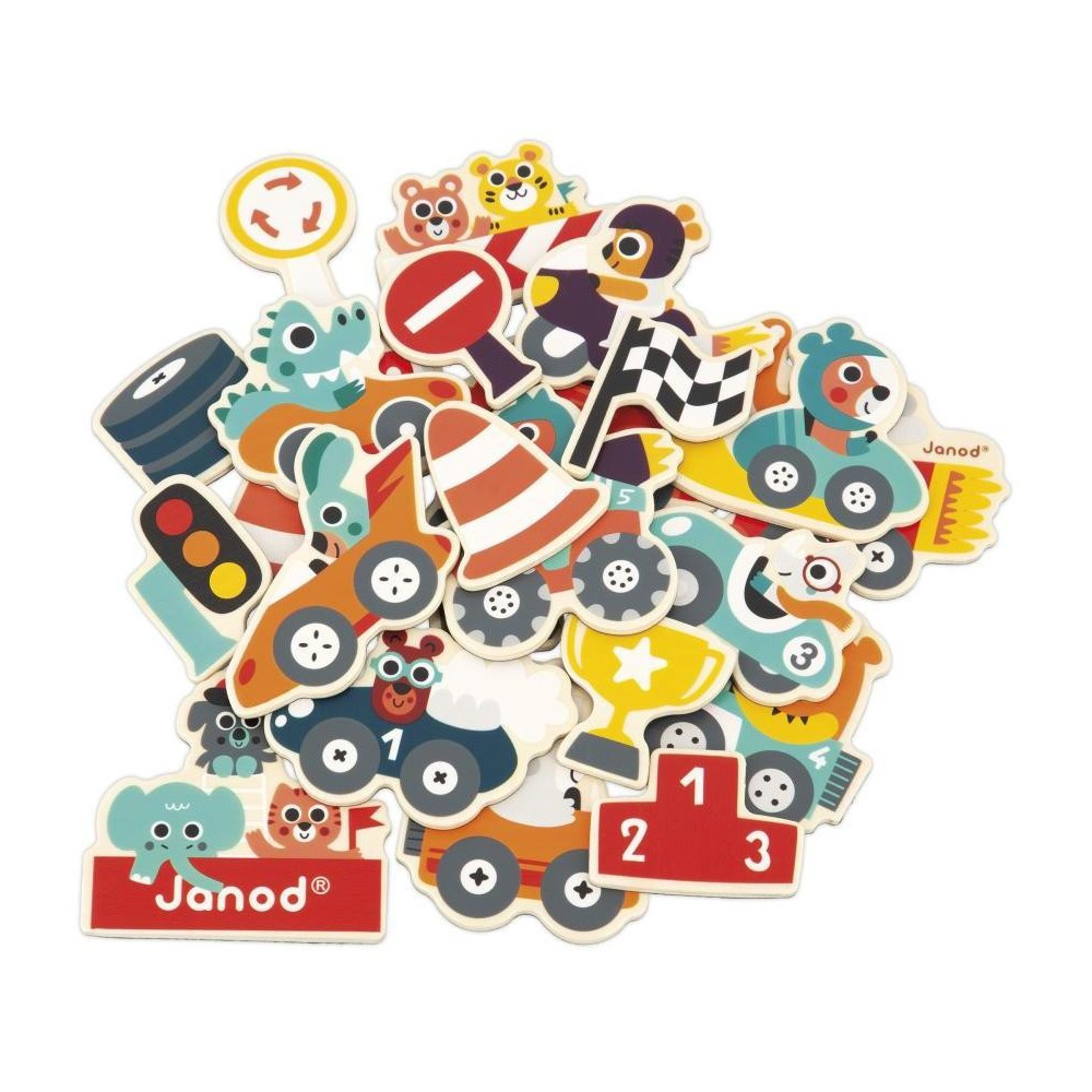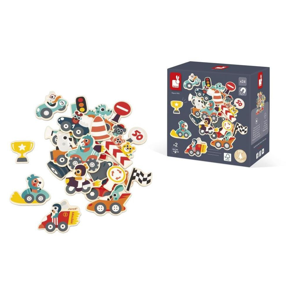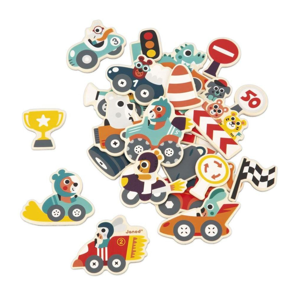 Ustúpte stranou! Malé autá sa blížia! Vytvorme bláznivé preteky s rôznymi vozidlami. Kolízia? Neprepadajte panike, odťahové vozidlo je pripravené pomôcť. Dostaňte sa do cieľa na odovzdávanie trofejí. Táto súprava pozostáva z 24 drevených magnetiek, ktoré sa prilepia na magnetické tabule, chladničky alebo akýkoľvek iný magnetický povrch. Vaše dieťa tak môže pri zábave rozvíjať svoju predstavivosť a zručnosť. Drevená magnetická hračka FSCTM. Pre deti od 2 rokov.