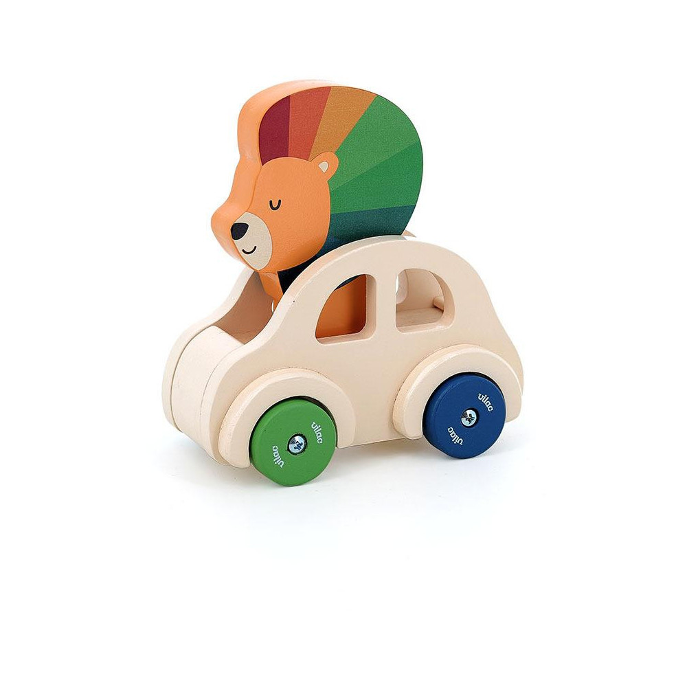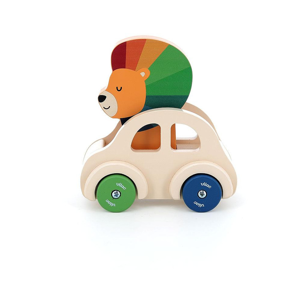 Dřevěné autíčko v přírodní barvě s barevnými koly, ve kterém sedí rozkošný lvíček s barevnou hřívou. Pod lvíčkem je zabudován klakson, proto když dítko zatlačí na hlavu lvíčka, ozve se zatroubení. Tento zvukový detail stimuluje zájem batolat a zároveň jim poskytuje přímou interakci s hračkou. Hračka je dokonale přizpůsobena pro malé ruce a rozvíjí fantazii, jemnou motoriku a koordinaci ruka-oko.