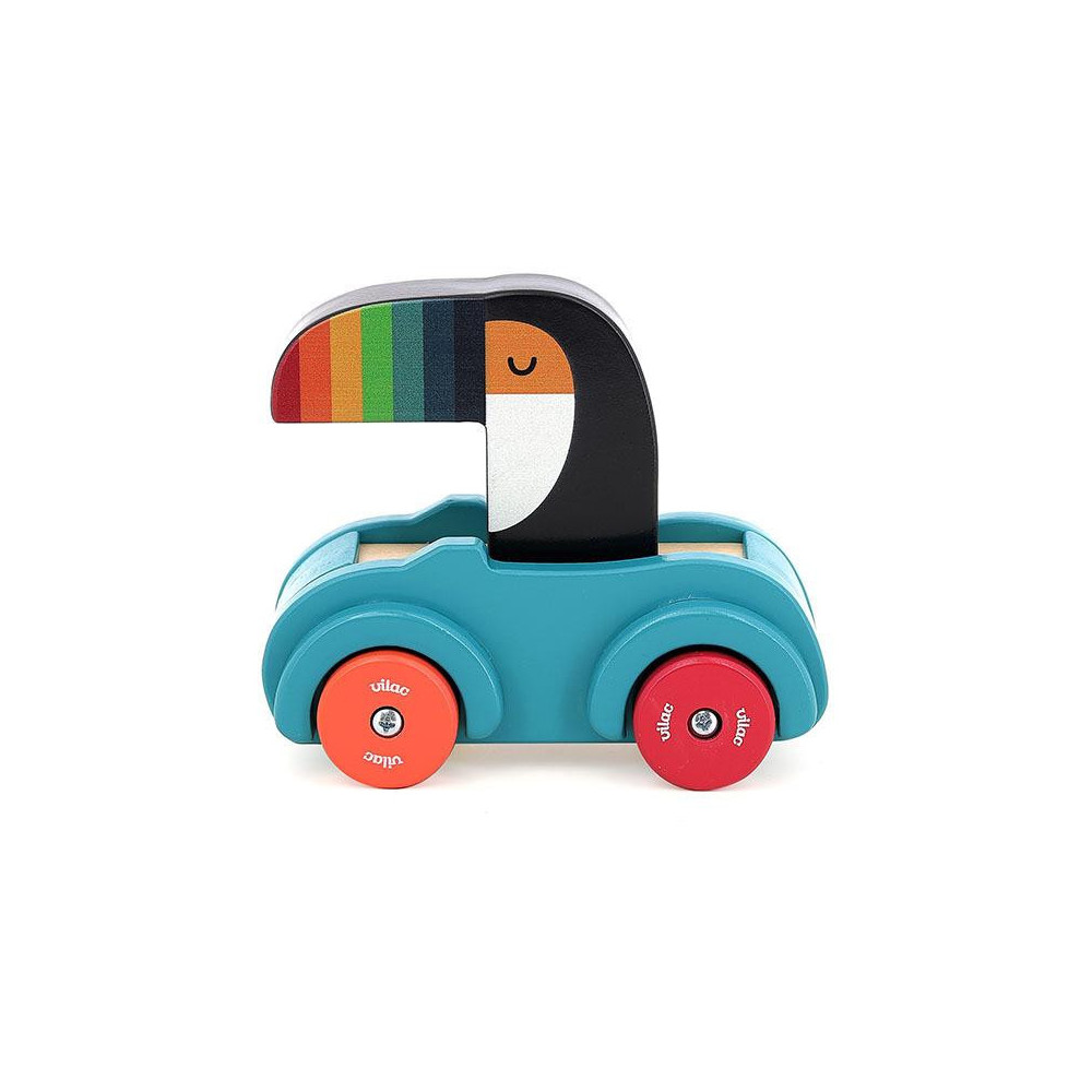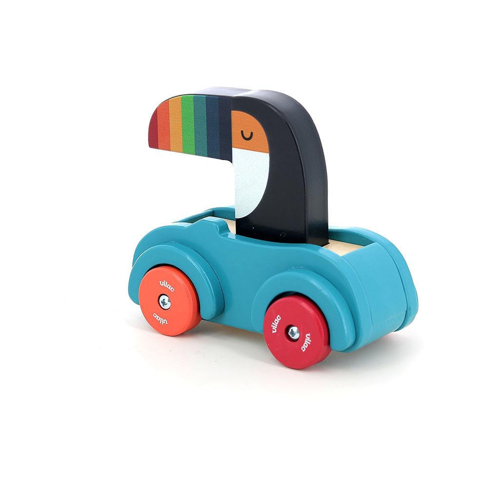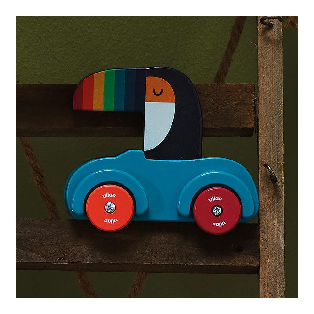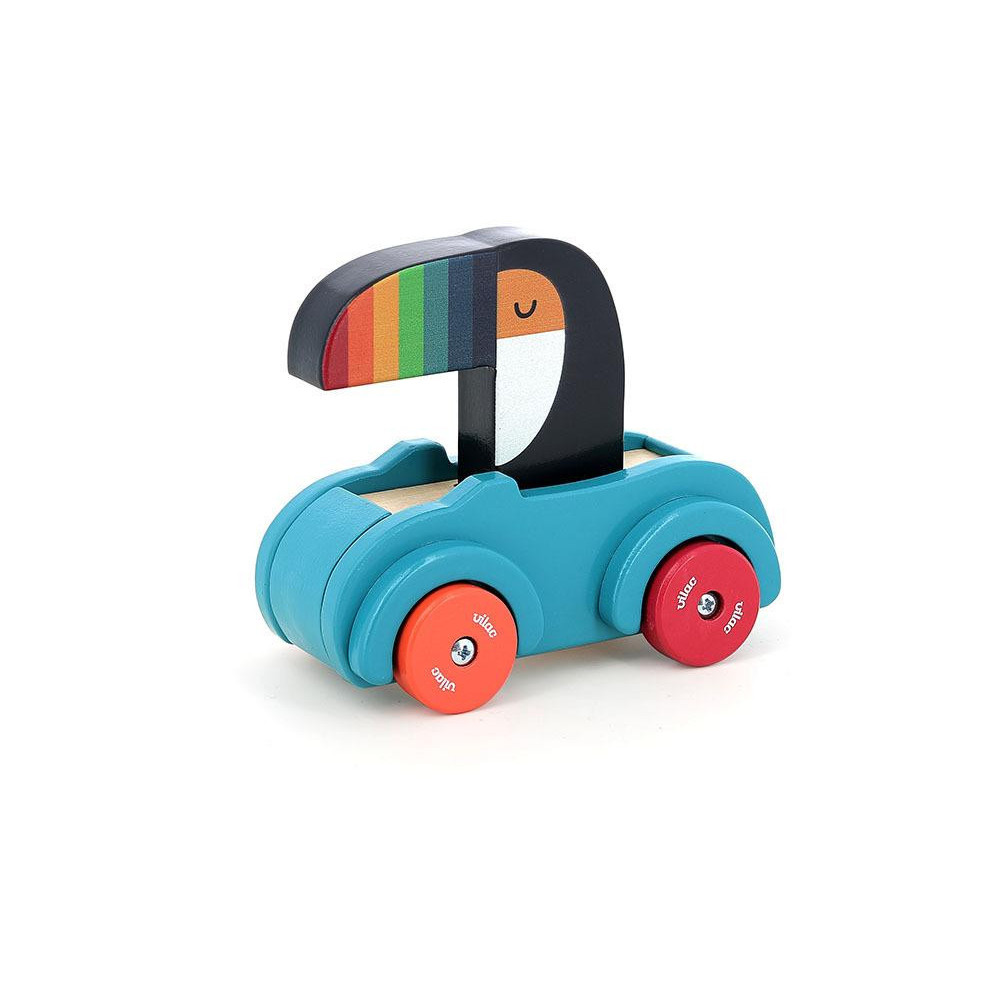 Dřevěné autíčko v modré barvě s barevnými koly, ve kterém sedí tukan s barevným zobákem. Pod tukanem je zabudován klakson, proto když dítko zatlačí na hlavu tukana, ozve se zatroubení. Tento zvukový detail stimuluje zájem batolat a zároveň jim poskytuje přímou interakci s hračkou. Hračka je dokonale přizpůsobena pro malé ruce a rozvíjí fantazii, jemnou motoriku a koordinaci ruka-oko.