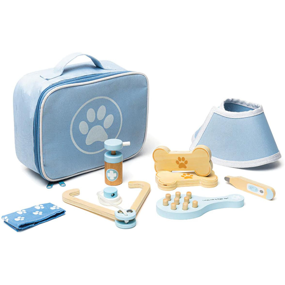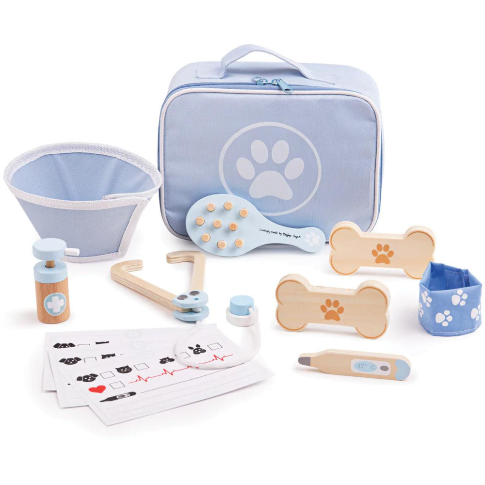 Tato praktická veterinární sada obsahuje vše, co mladí veterináři potřebují, aby mohli ošetřit nemocné medvídky nebo zvířata. Pomocí stetoskopu mohou děti poslouchat srdce pacienta, kontrolovat teplotu pomocí teploměru a dokonce se podívat do uší otoskopem. Tato hrací sada je dodávána zcela bez plastů ve snadno skladovatelné brašně.