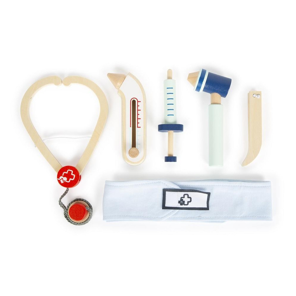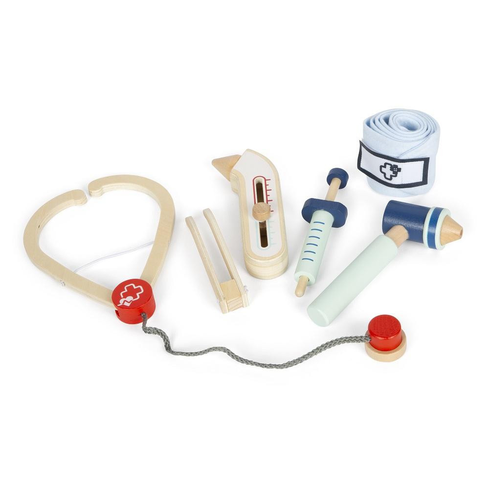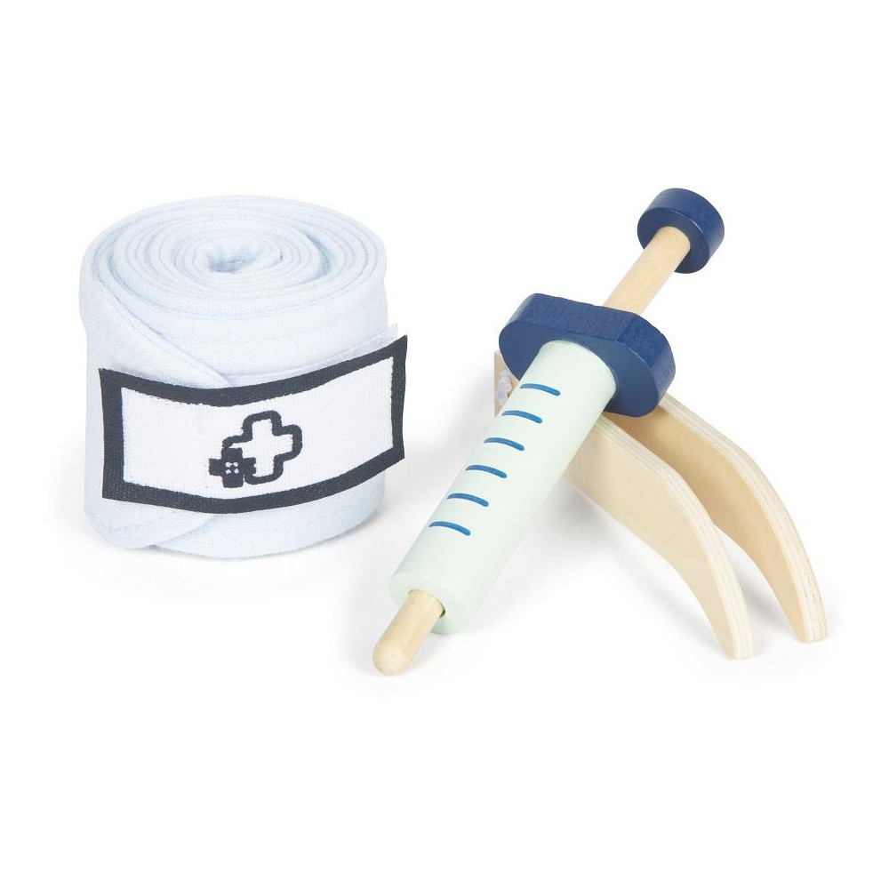 Ponořte se do vzrušujícího světa opravdové medicíny! Tato 6dílná sada má vše, co mladí lékaři potřebují. S lékařskou sadou jednoduše vyléčíte všechny nemocné plyšáky i panenky! Sada je vyrobena z robustního dřeva. Injekční stříkačka, teploměr, otoskop, pinzeta, obvaz a stetoskop nesmí chybět v žádné domácnosti malých lékařů. Tato herní sada aktivním způsobem inspiruje představivost a kreativitu mladých zdravotníků.