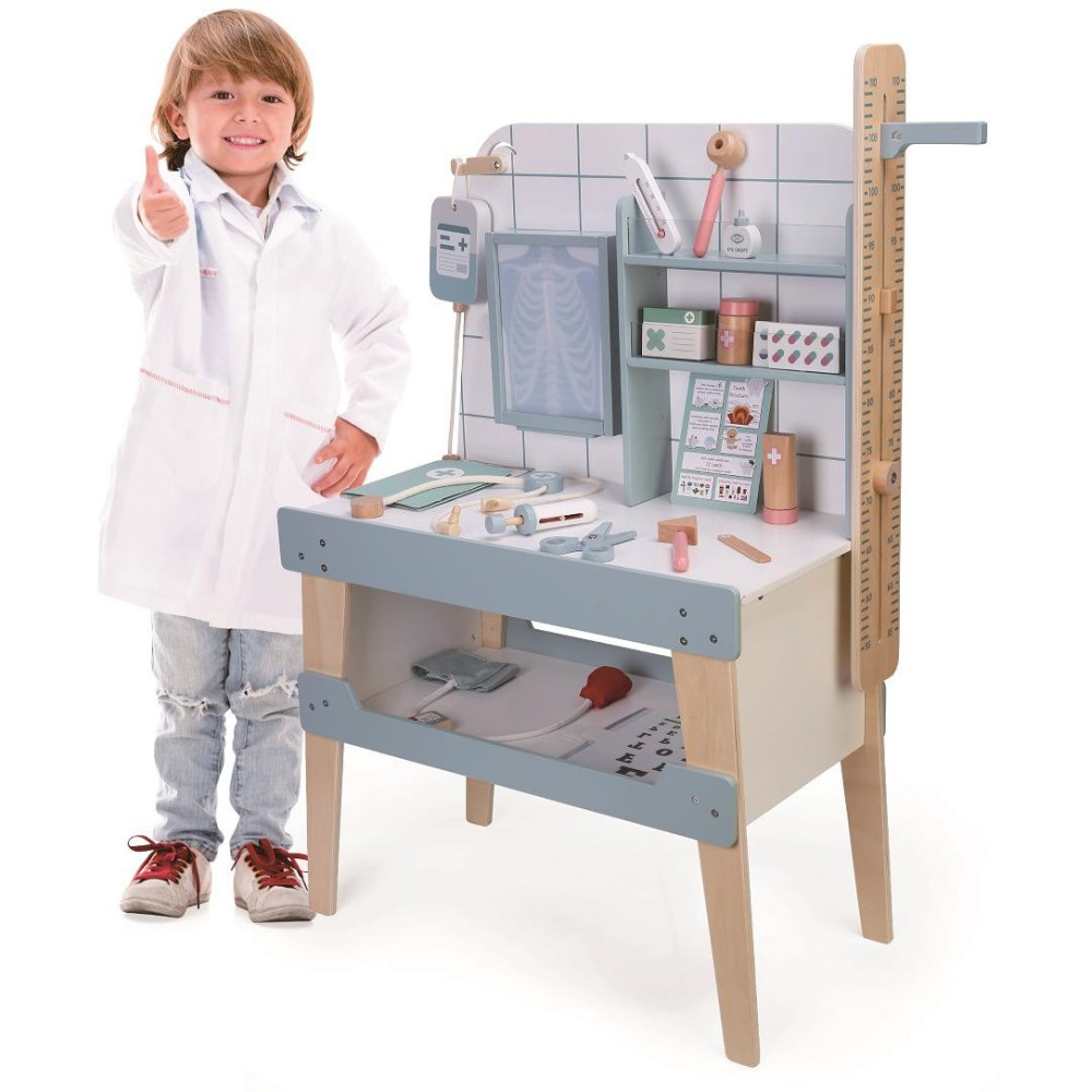 Znáte výšku svého pacienta? Ne? Pak ho změřte! Změřte mu i tlak nebo teplotu, poslechněte si ho a vše důkladně zapište do karty pacienta. Můžete také zkontrolovat zrak či sluch a nezapomeňte se podívat na rentgenové snímky na funkční podsvícené desce! Sada obsahuje stůl pro vyšetření a zákroky s úložným prostorem a nástroje nezbytné pro práci lékaře. Stetoskop, tlakoměr, teploměr, pinzetu, krabičky na léky a krémy, nůžky, infúzi, 4 RTG snímky, otoskop, injekční stříkačku, kladívko, karty pacientů, kartičky s léky, tabulku pro kontrolu zraku a informativní letáčky.