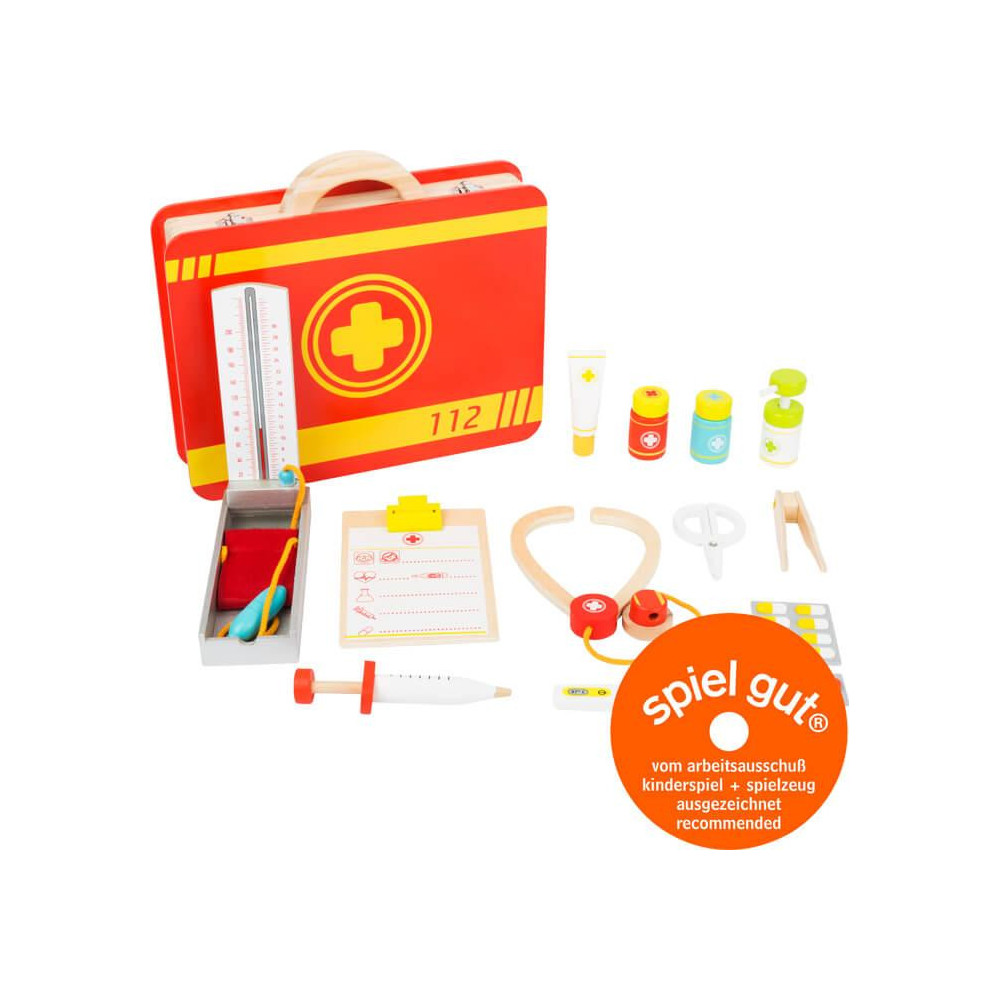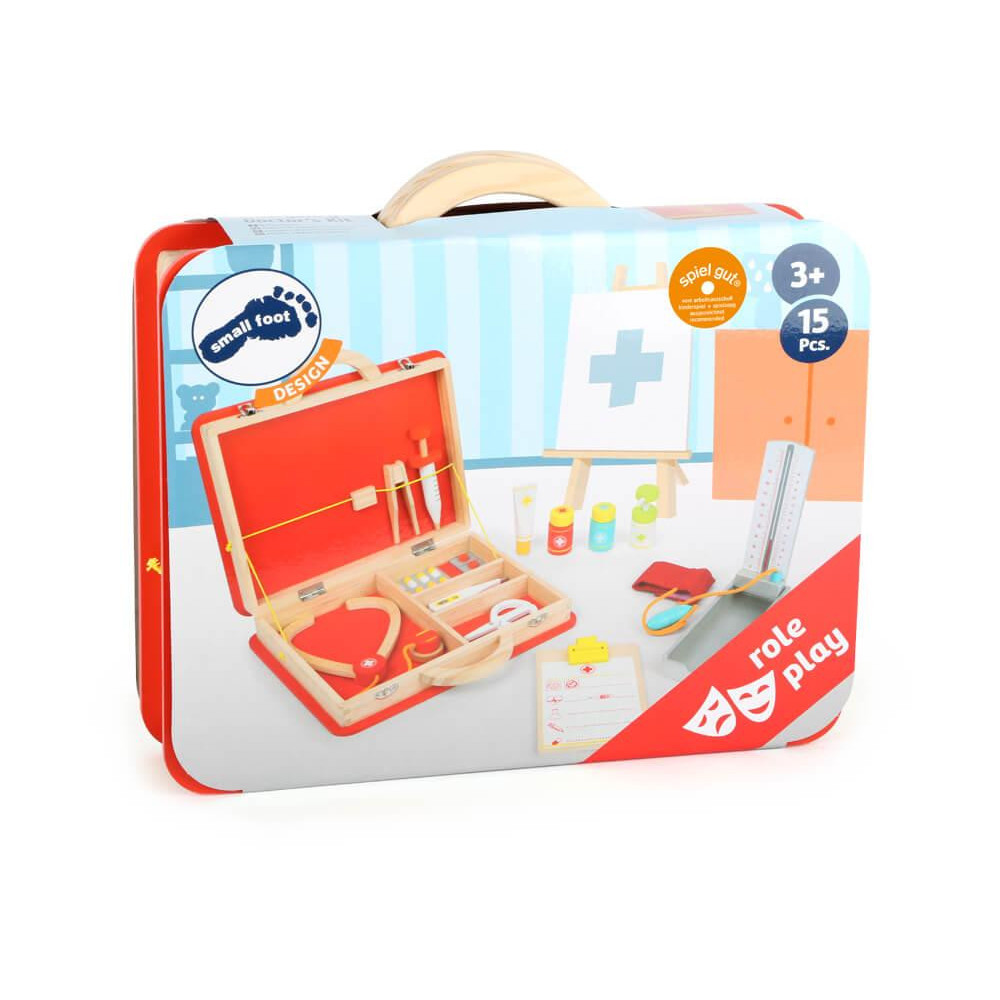 Trendy lékařská souprava v kufříku pro mladé doktory a doktorky. Všechny předstírané lékařské úkony u lékaře, nebo na pohotovosti, zvládnou děti v dětském pokojíčku s tímto dřevěným lékařským kufříkem.