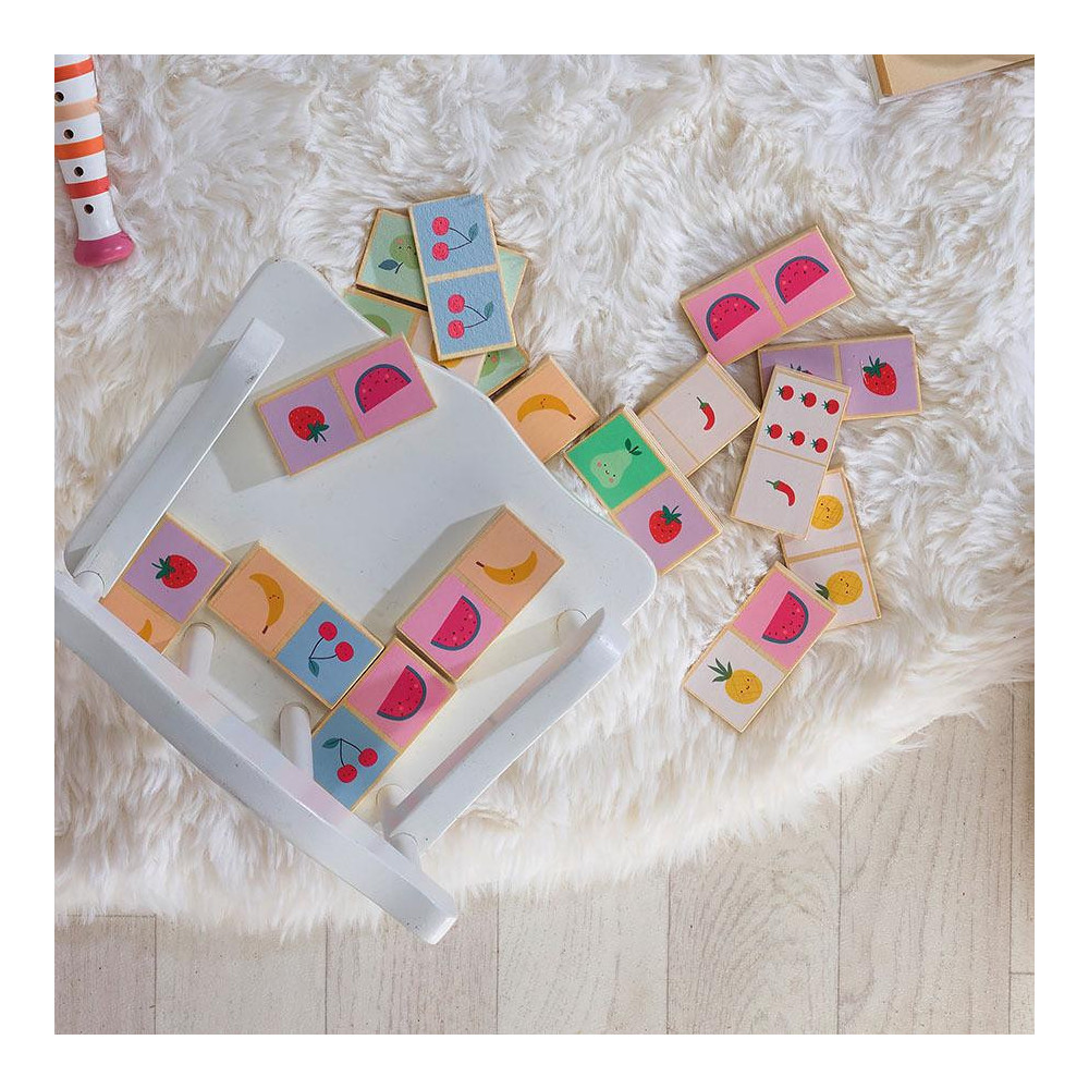 Domino je skvělý způsob, jak stimulovat paměť a postřeh Vašeho dítěte. Díky barevným ilustracím Sarah Betz se děti učí rozpoznávat a spojovat stejné druhy ovoce a zeleniny, čímž podporují schopnost soustředění. Hraním hry je také rozvíjena vizuální paměť a zábavnou formou se posilují kognitivní dovednosti. Je to vzdělávací hra, která podporuje jemnou motoriku, koordinaci ruka-oko, trénuje paměť a učení čísel a obohacuje slovní zásobu. A navíc? Domino je oboustranné! Jedna strana pro přiřazení stejných druhů ovoce, druhá strana pro přiřazení stejného počtu zeleniny.