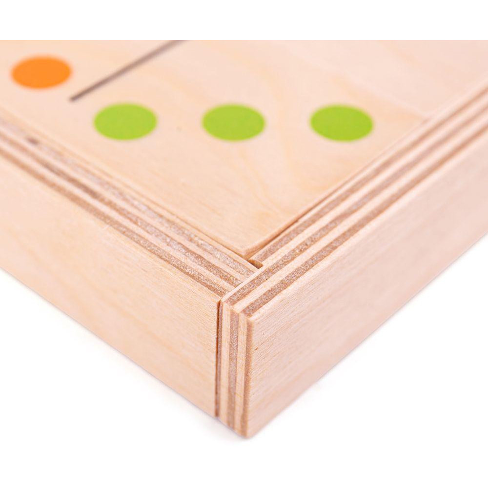 Tohle pestrobarevné dřevěné domino Jumbo, je perfektně dimenzováno pro malé ručičky, kterým se tak dílky snadno zvedají a umisťují. Hra pomáhá rozvíjet obratnost, dovednosti v souhře a koncentraci. Hrací dílky lze po ukončení hry uložit do dřevěné krabice s posuvným víkem.