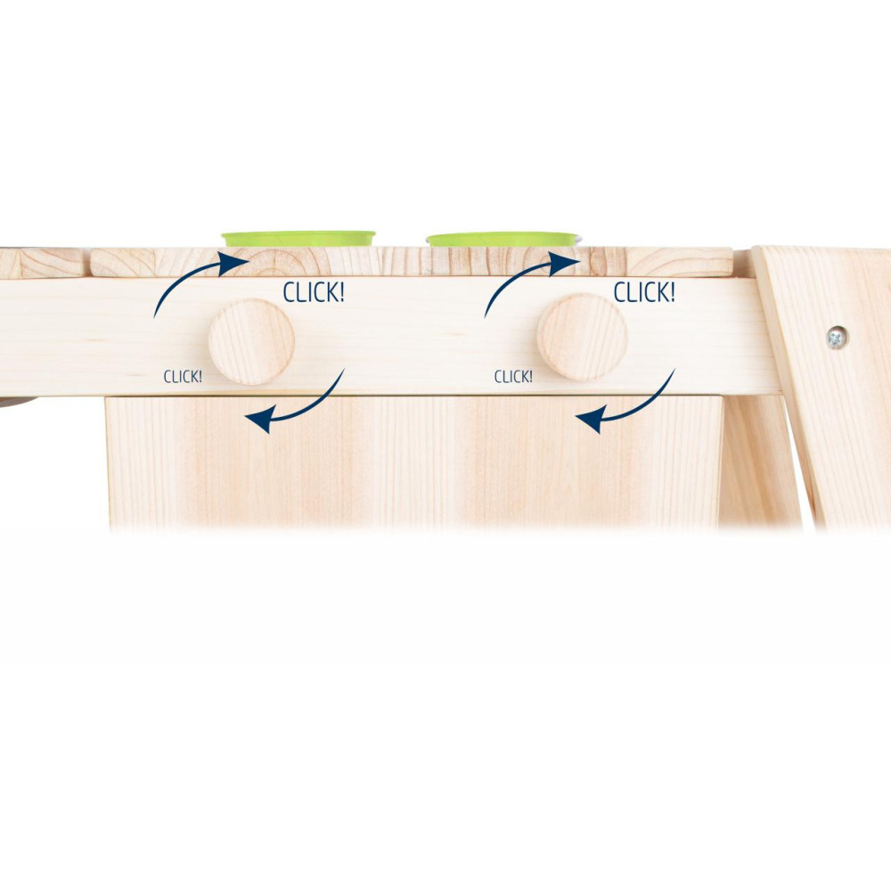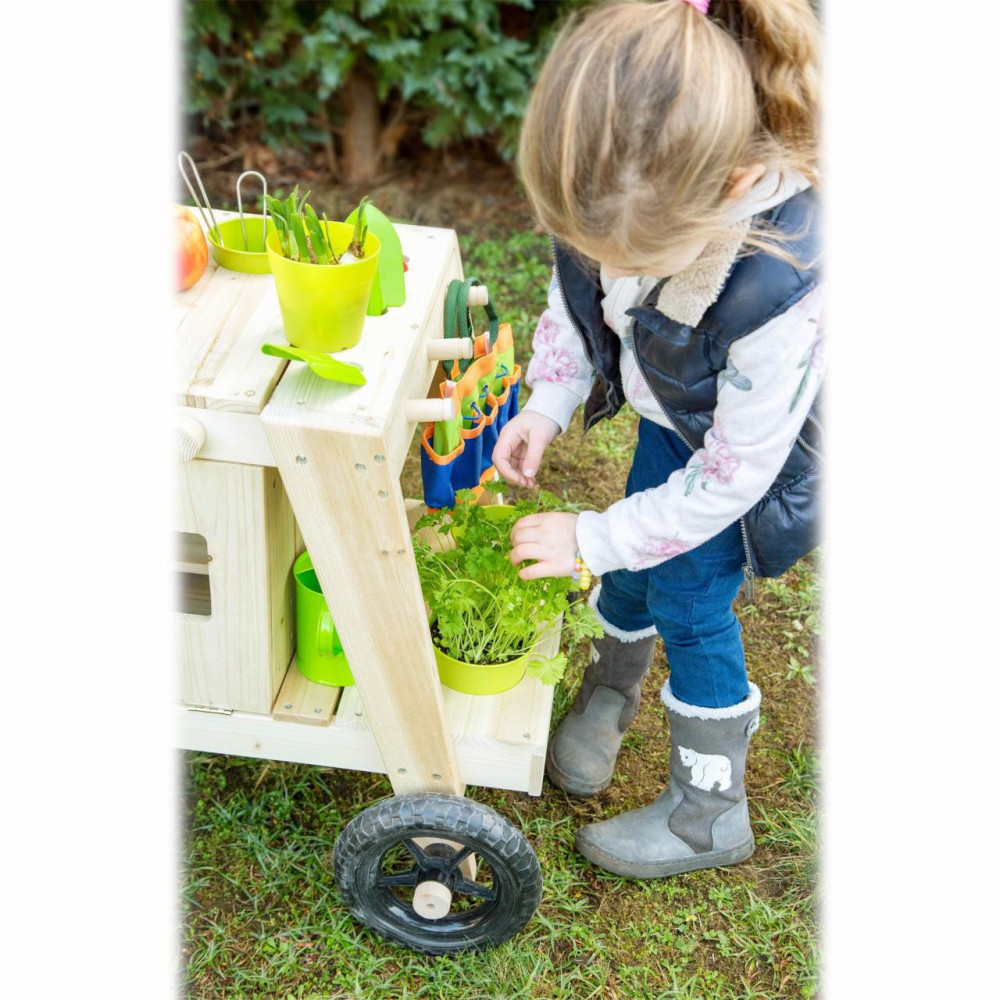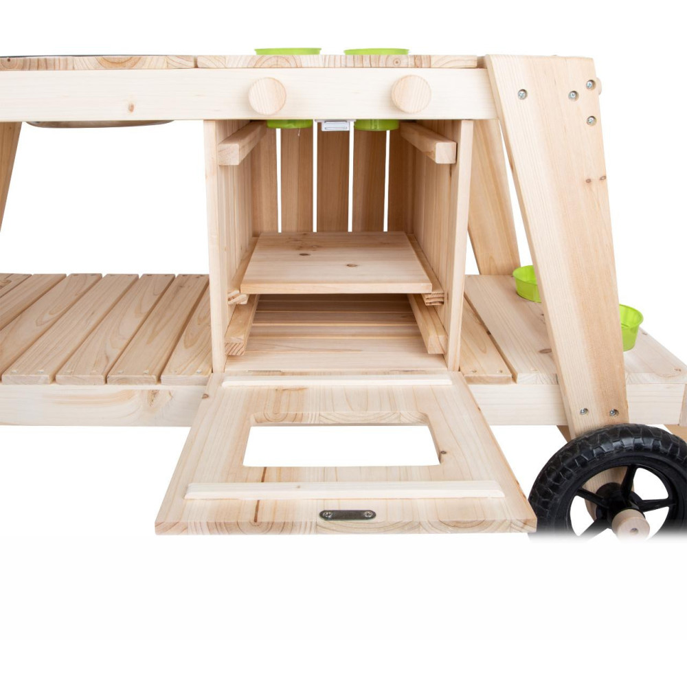 Kdo chce raději vařit venku, na sluníčku a čerstvém vzduchu? Tomu příjde vhod kuchyňka, která svou barevností zapadne do přírody. Je opatřená velkými kolečky a s pomocí dospělého ji lze přemisťovat i v nerovném terénu. Nabízí pevnou a odolnou konstrukci z neošetřeného přírodního dřeva, které pobízí, abyste si ji hravě nalakovali dle vlastní fantazie. Její prostorná pracovní plocha je přístupná ze všech stran a lze ji snadno využít k mnoha různým činnostem. Kuchyňka nabízí troubu opatřenou dvířky s magnetickým zavíráním a dvojicí knoflíků, které otáčením vydávají cvakavé zvuky, pečení jako opravdové! Uvnitř trouby naleznete praktickou dřevěnou desku, kterou lze využít dle potřeb, nejen jako pečící plech. Objemné úložné prostory mohou sloužit k uskladnění kuchyňského, ale i zahradního nářadí. K tomu je kuchyňka vybavena množstvím odkládacích otvorů a závěsů pro další, nejrůznější náčiní. Součástí kuchyňky je větší mísa, menší misky a květináče, vše vyrobené z odolného kovu. Vyrazíte k záhonu, pískovišti, nebo připravit svačinu u bazénu? Výrobek vyžaduje montáž, dodáváno s obrázkovým návodem k sestavení. Hlavní vlastnosti:polní kuchyňka, 2 květináče, 1 větší mísa, 2 menší misky a pracovní deskatrouba s dvířky a otočnými knoflíky poskytujícími zvukovou odezvuobjemné úložné prostory, odkládací otvory a háčkyopatřeno kolečky, snadno přemístitelnémultifunkční, rozmanité využitíneošetřené dřevo vhodné k osobitým úpravám a lakování