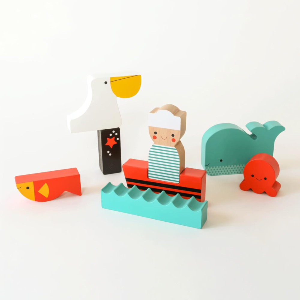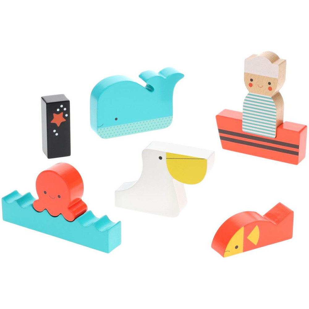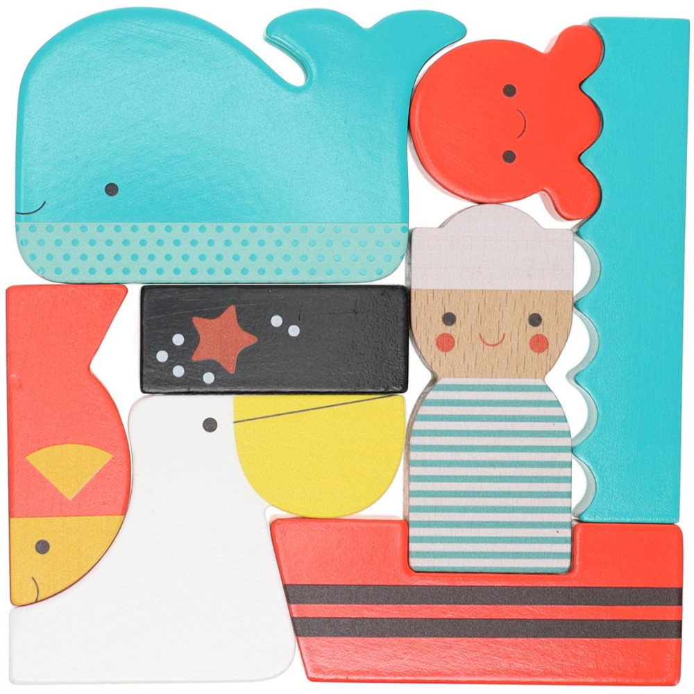 Nechejte děti rozvíjet příběhy s barevnou skládačkou. Mohou tvořit scény s figurkami námořníka a zvířátek, nebo dílky sestavovat jako hlavolam. Dílky jsou vyrobeny z odolné překližky a přizpůsobeny dětským ručkám.