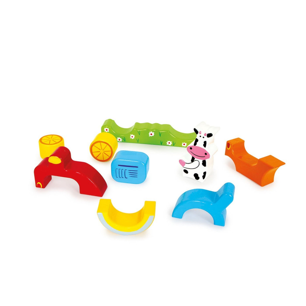 Z magnetů a devíti barevně lakovaných prvků různých tvarů z hladkého dřeva se zaoblenými hrany lze sestavit krávu s traktorem!