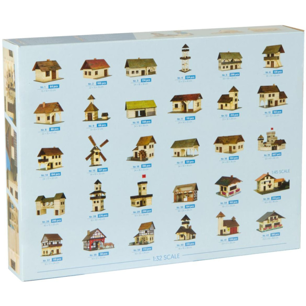 Dřevěná slepovací stavebnice obsahuje dřevěné hranolky daných délek ke stavbě roubených stěn, díly na střechy a štíty, kartonové výseky oken a dveří i předtištěné papírové potisky. Součástí stavebnice je schematický montážní plán. Ve stavebnicích HOBBY KITS naleznete vše potřebné k sestavení. Ke stavbě slouží jednoduché obrázkové návody se symboly jednotlivých úkonů, a proto je můžou sestavovat děti po celém světě. Základním stavebním materiálem jsou přesně zhotovené hranoly z borového dřeva a rozměru 9×9 mm v délkách od 16 do 230 mm určených ke stavbě roubených stěn. Plochy střech, štítů, pavlačí a teras jsou zhotoveny z překližky 3 mm a polepují se papírovými potisky. Funkční dveře a okna zasklená folií jsou z potisklého kartonu. Jednotlivé stavby se slepují lepidlem na dřevo a papír (není obsahem). Součástí návodu jsou malé kapitoly ze stavebního oboru a historie lidové architektury. Modely staveb jsou v měřítku 1:32.Hotové stavby jsou estetickými doplňky dětských pokojíčků, využívají se ke hrám s autíčky, zvířátky, vojáčky i panenkami, o vánocích mohou tvořit základ lidového Betlému. Hlavní vlastnosti: 124 dílů celkemMěřítko: 1:32precizní a pečlivé zpracováníz odolného borového dřevavyrobeno v České republice Ukázka stavby a velikosti dílů, video je pouze ilustrační. Dokumentace: návod ke stavbě