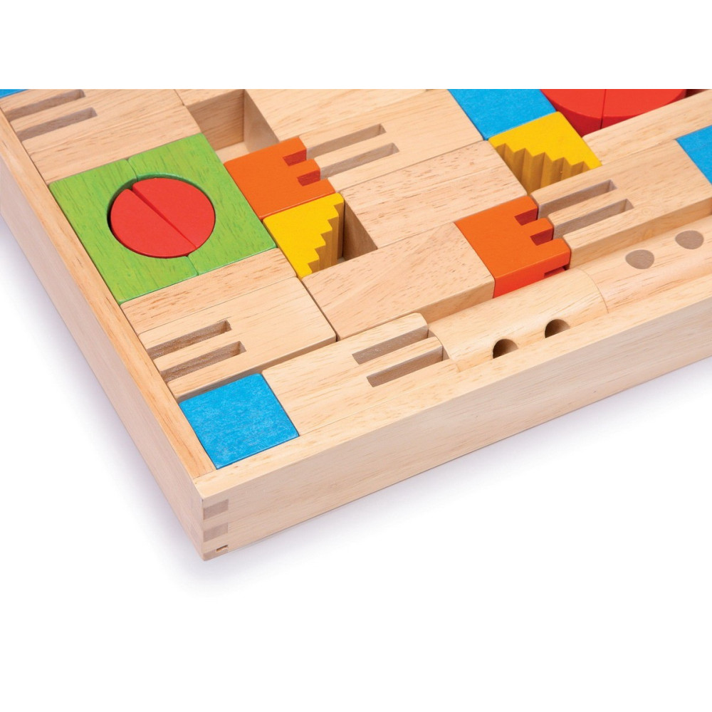 Krabice a stavební kostky v různých tvarech jsou z masivního bukového dřeva a bezbarvě nebo barevně nalakované. Dětské ruce mohou stavět stále nové stavby a hravým způsobem si trénují trpělivost a šikovnost.