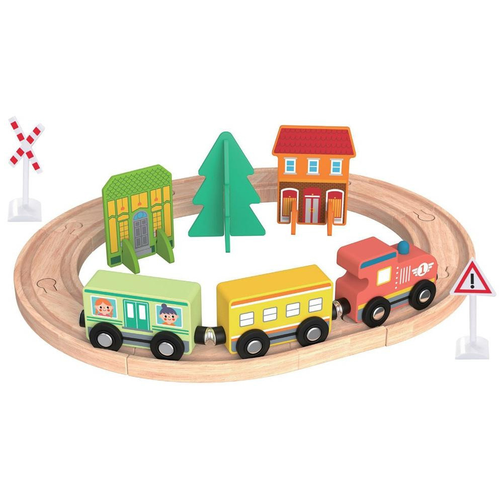 Sestavte koleje, zapojte vagónky za lokomotivu a můžete vyrazit na výlet! S touto barevnou vlakovou soupravou si děti užijí spoustu zábavy. Kromě kolejí a vláčku je součástí balení také strom a dva domy. Vagónky jsou velikostí vhodné pro malé dětské ručičky a zapojí se jednoduše pomocí magnetu. Hračka inspiruje k vyprávění příběhů a zlepšuje komunikační dovednosti. Rozvíjí také zručnost a jemnou motoriku. Je vyrobena z kvalitního dřeva z certifikací FSC®.