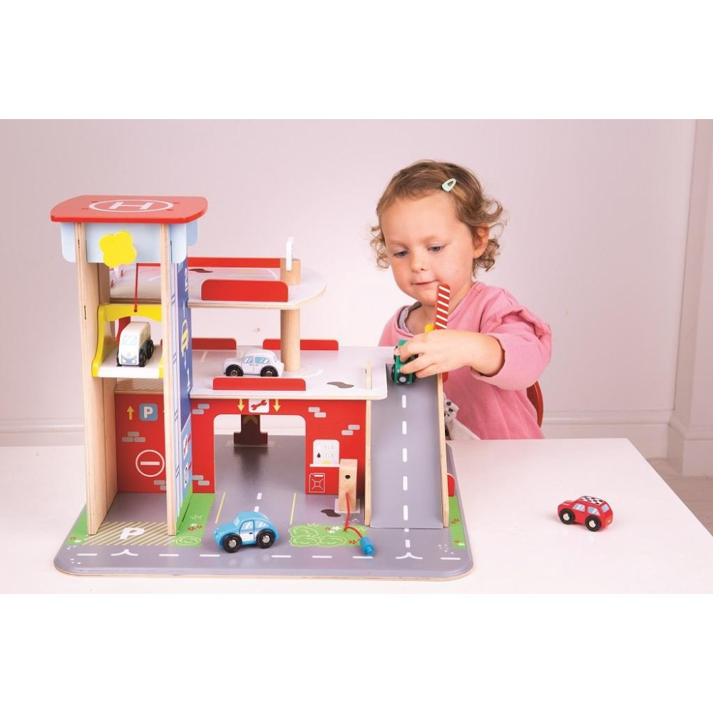 Děti si užijí hru plnou zábavy na každém ze tří pater garáže s parkovištěm. V přízemí mohou autem vjet na fungující výtah a poté vyjet až do druhého patra a zaparkovat. V přízemí děti najdou servis, myčku i pumpu. Z prvního patra mohou auta odjíždět za pomocí výtahu nebo po rampě, ale pozor, auta musí počkat na zvednutí závory! Nejvyšším bodem garáže je heliport. Tato garáž má prostě vše, co malý řidič potřebuje pro dopravení se z bodu A do bodu B. Podporuje kreativitu a představivost. Vyvíjí koordinaci ruka-oko, jemnou motoriku a zručnost. Možno doplnit autíčky Bigjigs Toys a Bigjigs Rail. Vyrobeno z kvalitních materiálů z odpovědných zdrojů.