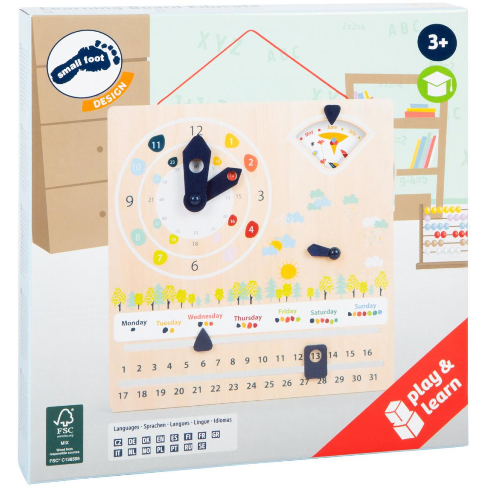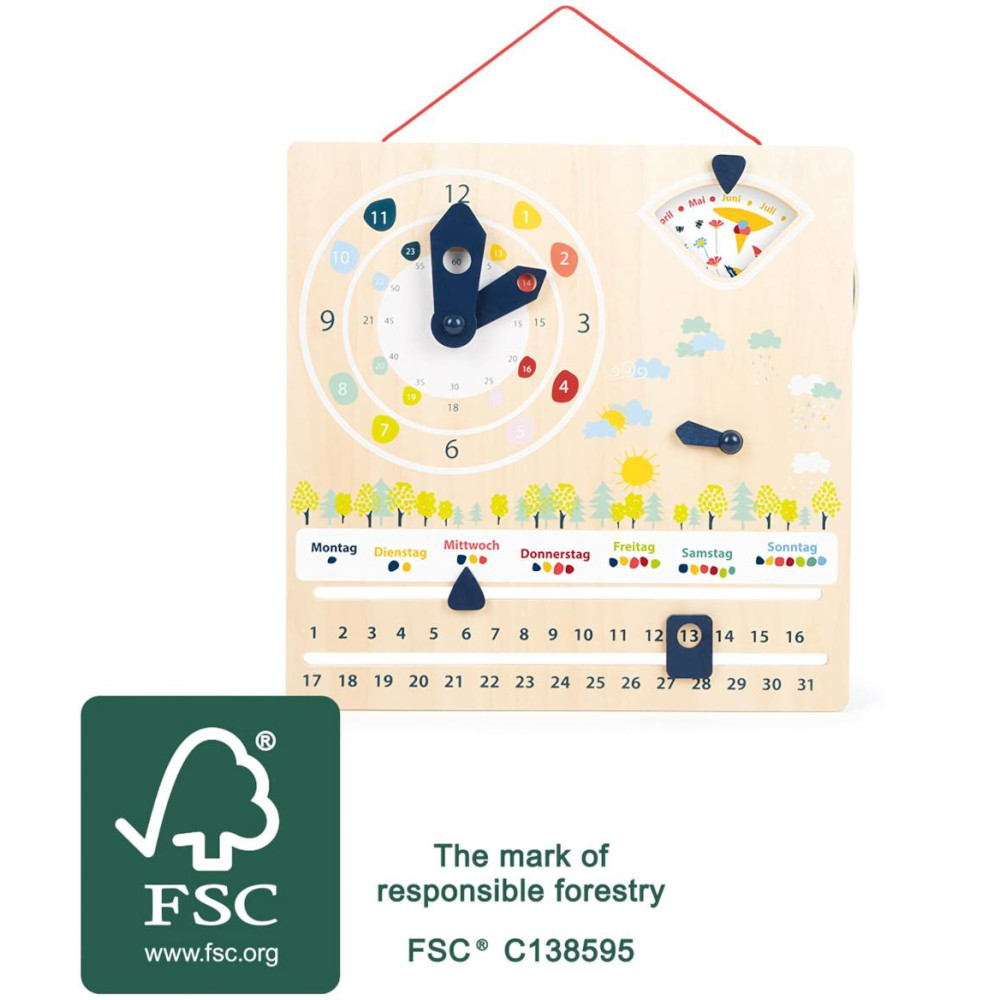 Podporují děti v učení se času ve 12 a 24 hodinovém systému. Současně zprostředkovávají znalosti o počasí, dnech v týdnu, měsících a ročních obdobích hravým způsobem pomocí jednoduchých ilustrací. Při nastavování ručiček jsou současně trénovány motorické dovednosti. Se závěsným zařízením a nálepkami, pro použití v 15 evropských jazycích: CZ, DE, DK, EN, ES, FI, FR, GR, IT, NL, NO, PL, PT, RU, SE. Hlavní vlastnosti: procvičuje motorické schopnostipoužití v 15 evropských jazycíchučí poznávat čas a datumvyrobeno z 100% FSC dřeva Značka a certifikát FSC® (Forest Stewardship Council) zaručuje, že dřevo, ze kterého byl produkt vyroben, nebylo vytěženo nelegálně a pochází z lesů obhospodařovaných šetrným či přírodě blízkým způsobem, ve kterém jsou dodržovány přísné environmentální a sociální požadavky. Značka FSC® na výrobku znamená, že svým nákupem pomáháte chránit lesy a podporujete šetrné, odpovědné či přírodě blízké hospodaření, díky kterému jsou naše lesy stabilnější, zdravější, mají přirozenou druhovou skladbu a lépe odolávají negativním následkům klimatických změn.