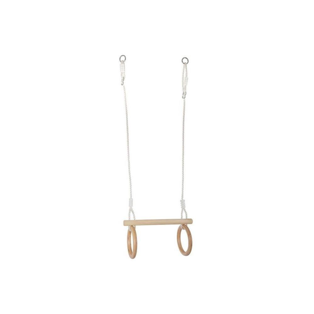 Věk: 3+ Materiál: kov, dřevo, plast, látka Rozměry: Délka lana 100 cm, délka hrazdy 45cm, Ø kruhů 15 cm Max. nosnost 100 kg