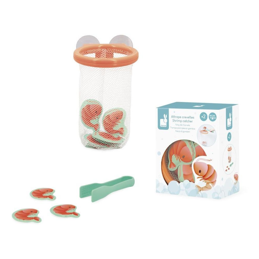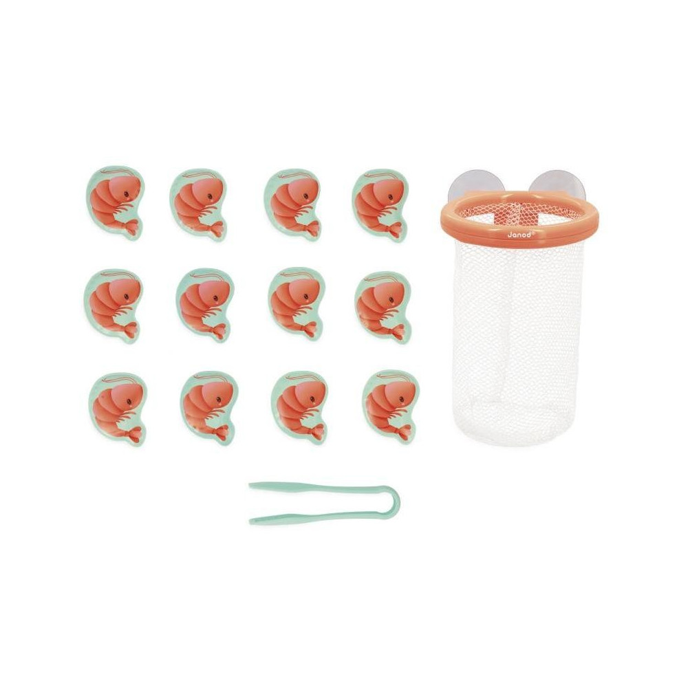 12 malých kreviet uniklo do vane, musíte ich rýchlo chytiť! Pomocou malých klieští môže vaše dieťa chytiť každú krevetu, ktorá pláva na hladine vody, a umiestniť ju do pekného košíka, ktorý sa pomocou prísaviek prichytí na dlaždice. Táto hra umožní vášmu dieťaťu rozvíjať zručnosť a zároveň sa zabaviť vo vani. Hračka do vane pre deti od 2 rokov.