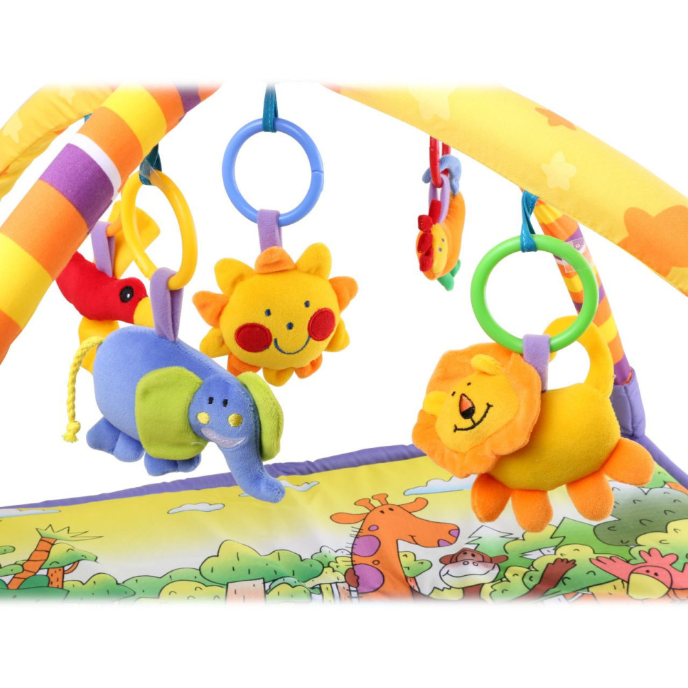 Kdo by nechtěl dovádět obklopený těmi nejroztomilejšími zvířátky! Příjemně měkká pestrobarevná podložka zdobená zvířecími motivy umožňuje nejmenším pohodlně ležet a hrát si s plyšovými hračkami pod klenbou z měkkých a pružných podpěr. Poutavé hračky různě chrastí, nebo pískají, přispívají tak k vývoji dětských smyslů a motoriky, motivují a postupně učí děti sedět. Jsou zavěšené na rozevíratelných kroužcích umožňujících jejich odepnutí, děti tak mohou mít své oblíbence vždy u sebe. Podložka je skladná a snadno rozložitelná, balená a dodáváná v praktické, snadno přesnosné plastové tašce.