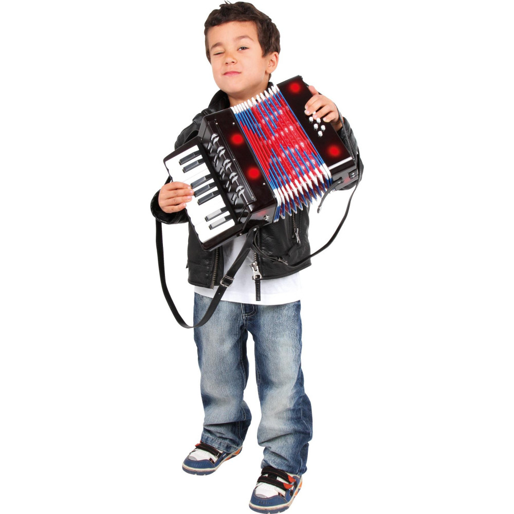 Nový design jednoho z oblíbených nástrojů v nabídce přináší svět hudby do dětských pokojů! Díky nastavitelným ramenním popruhům nemusí děti nástroj držet v rukou a mohou se soustředit na hraní. Ještě více kláves na lesklé lakované harmonice poskytuje potěšení z poslechu různých harmonií a trénuje jemnou motoriku uměleckým způsobem.