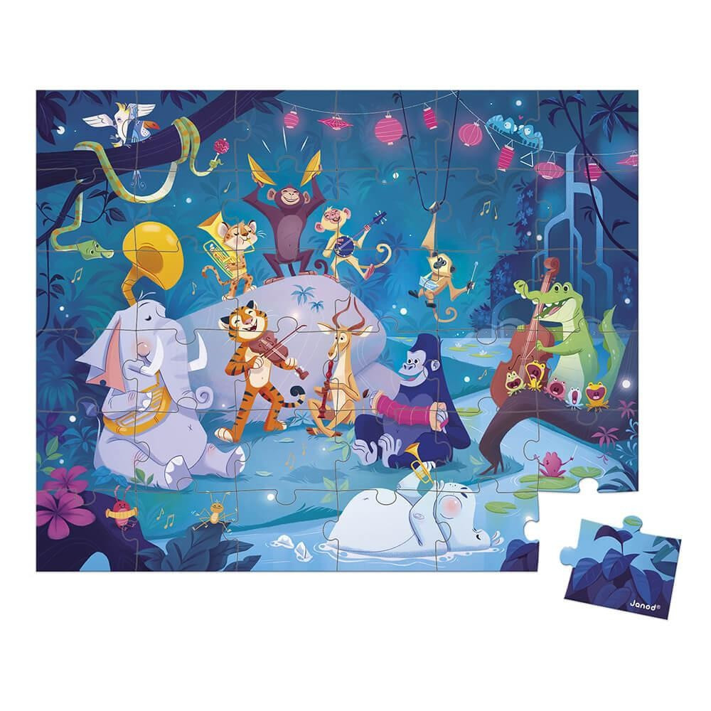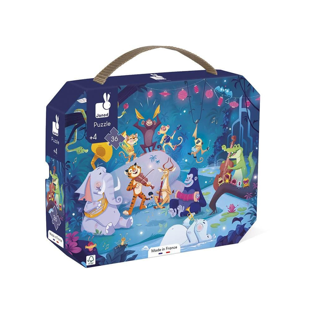Vezmite svoje dieťa na koncert pod holým nebom hlboko v džungli! Pohltí vás spolu so zvieratkami hudba a očarujúca atmosféra festivalu s týmto nádherným 36-dielnym kartónovým puzzle s množstvom pestrofarebných detailov. S týmto krásnym 36-dielnym kartónovým puzzle bude vaše dieťa rozvíjať svoju pamäť a zručnosť. Puzzle sú balené v originálnom a praktickom kufríku vhodnom na doma aj na cesty. Balenie obsahuje plagát, ktorý slúži ako vzor pre začiatočníkov, skúsenejší si potom môžu skladačku poskladať sami. Puzzle rozvíjajú logické myslenie, pozornosť, pamäť, predstavivosť, rozlišovanie farieb, tvarov a veľkosti. Učia nás vnímať vzťah medzi časťami a celkom a sú užitočné pri rozvoji motoriky rúk. Vyrobené vo Francúzsku, produkt FSC® s použitím rastlinného atramentu. Rozmer poskladaných puzzle: 50 x 40 cm Puzzle obsahujú 36 ks dielikov Vhodné pre deti od 4 rokov
