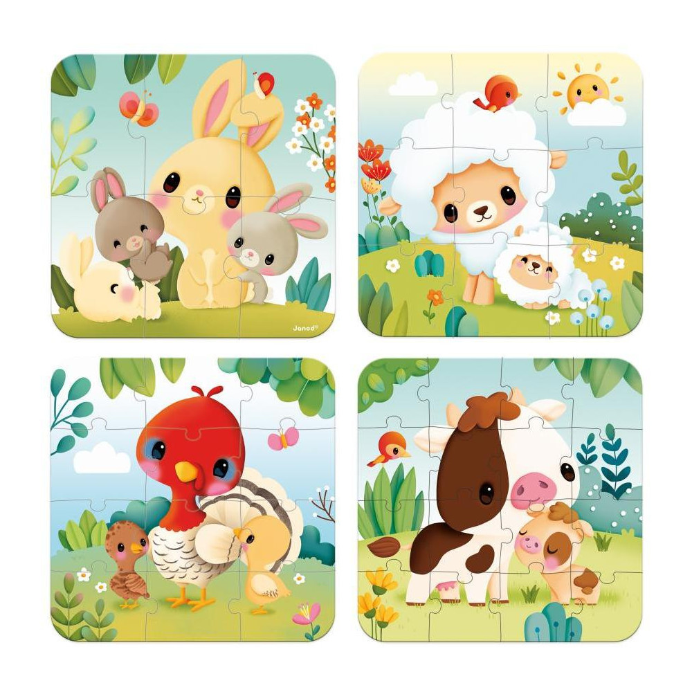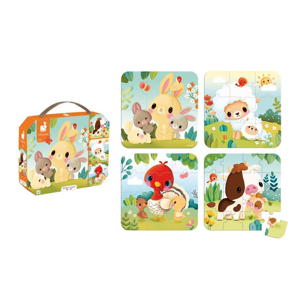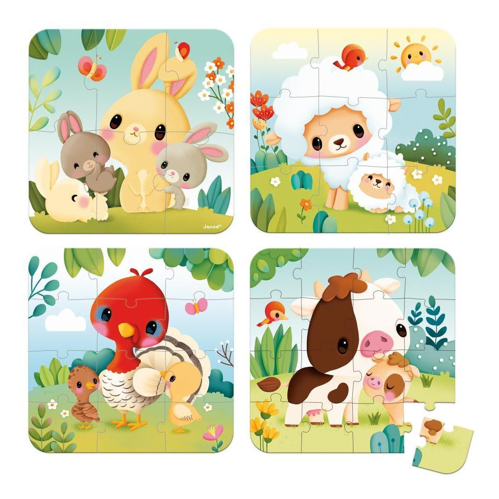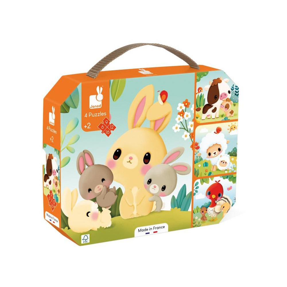 Príďte a pozrite sa na hospodárske zvieratá! S touto sadou 4 rastúcich puzzle si deti vo veku od 2 rokov rozšíria svoju slovnú zásobu a rozvinú logické a motorické zručnosti, obklopené krásnymi ilustráciami. Tieto 4 kartónové puzzle sa líšia počtom dielikov: sú škálovateľné v rozsahu od 6 do 16 dielikov! Bábätká tak môžu napredovať vlastným tempom a zároveň sa zoznamovať s hospodárskymi zvieratami. Ideálna voľba, ktorá pomôže vášmu dieťaťu rozvíjať jeho jemné motorické zručnosti krok za krokom, od 6 a 9 dielikov až po 12 až 16 dielikov: bude potešené sledovať jeho pokroky! Svoje farmárske skladačky môžu drobci dokončiť aj sami, vďaka farbe podkladu špecifickej pre každé puzzle. Kto by mohol viac rozčúliť malých ako malé hospodárske zvieratá? Nechajte sa ukolísať roztomilými ilustráciami, ktoré deťom pomôžu naučiť sa mená zvieratiek a ich mláďat: králik a jeho zajačiky, ovečka s jahniatkom, kravička s teliatkom a morka a jej hydina. Šikovné: do kufra sa zmestia vaše 4 puzzle, rovnako ako naši malí spoločníci. Puzzle sú ideálne na vštepovanie logiky, koncentrácie a pokoja deťom. V kombinácii s krásnymi ilustráciami je konečným výsledkom mimoriadne výhodná prvá detská skladačka podporujúca vývoj. Táto sada puzzle je vyrobená vo Francúzsku z kartónu s certifikátom FSC™. Je zdobený atramentmi na rastlinnej báze.