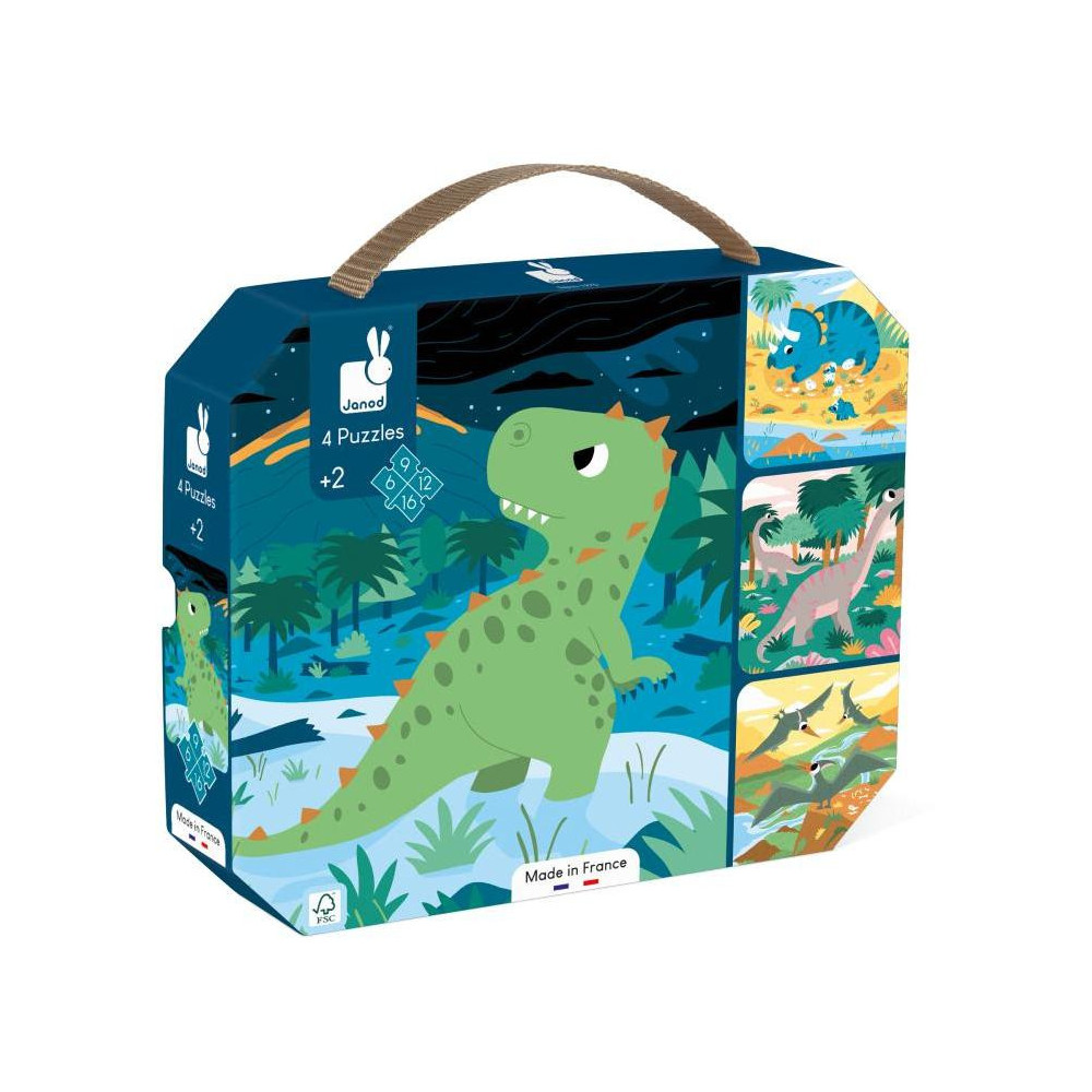 Na vašich malých prieskumníkov čaká prehistorická cesta! S týmito 4 rastúcimi puzzle s tematikou dinosaurov môžu deti vo veku od 2 a viac rokov preskúmať obdobie Jury. Každé puzzle je zložené zo 6, 9, 12 a 16 dielikov – pomôže vášmu dieťaťu napredovať a zároveň stimulovať jeho jemnú motoriku a koncentráciu. Výzva vhodná pre každý vek! Každé puzzle má inú farebnú podložku, ktorá pomáha najmenším jednoducho poskladať 4 puzzle. Okrem toho veľké kusy perfektne padnú do malých rúk, vďaka čomu je hra zábavnejšia a príjemnejšia. Zábavná cesta v čase: predstavte si radosť svojho dieťaťa, keď poskladá jednotlivé dieliky a odhalí majestátneho dinosaura, pričom sa bude učiť rozpoznávať rôzne druhy! Je to skvelý spôsob, ako spojiť hru a učenie. Praktické: tieto puzzle sa dodávajú v prenosnom kufríku s rukoväťou, takže si ich deti môžu vziať, kam sa im zachce. Či už idete na výlet alebo na návštevu k starým rodičom, vaše ratolesti si túto pokojnú a podnetnú aktivitu určite zoberú so sebou. Tak čo, ste pripravení vydať sa na cestu časom s našimi hádankami o dinosauroch?Toto puzzle je vyrobené vo Francúzsku z kartónu FSC™ a ilustrované atramentami na prírodnej báze. Vhodné pre deti od 2 rokov.