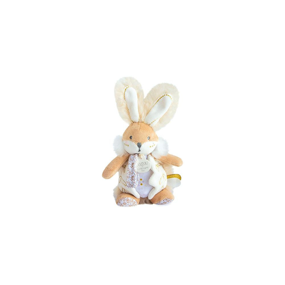 Něha, pastelové barvy a spousta rafinovanosti je tento králíček s chrastítkem a také držákem dudlíku. Doprovází miminko od narození, aby mu přinesl hebkost, pohodlí a také držel dudlík v jeho blízkosti. Rozvíjí smysly a zvědavost. Je to velmi pěkný dárek k Vánocům nebo k oslavě narození miminka. Je extrémně měkký a příjemný na dotek.