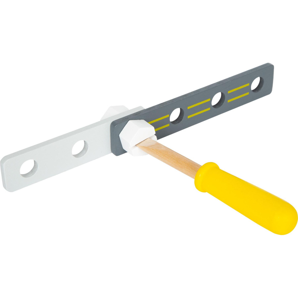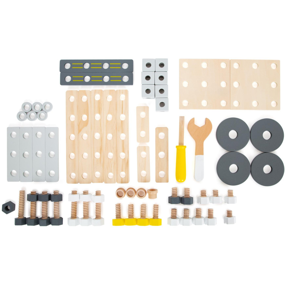 Sada bsahuje 2 dřevěné nástroje (klíč, šroubovák), Rozsáhlé příslušenství od konstrukčních lišt, konstrukčních desek, šroubů, matic, kostek, kol, adaptérů kol a distančních pouzder a také box pro a ukládání celé sady.