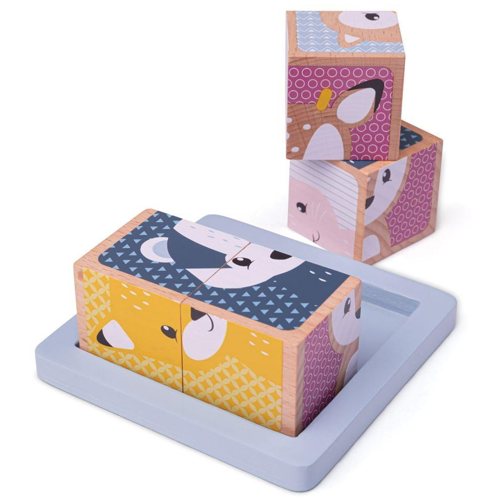 Šest dřevěných kostek vytváří šest různých obrazů lesních zvířat. Otočte každou kostkou a najděte kousky, které tvoří obrázek, nebo je promíchejte pro zábavu! Pomáhá rozvíjet obratnost, schopnosti shody a soustředění. Kompaktní rozměry zajišťují, že tato hračka je užitečným spoluhráčem doma i na cestách. Dřevěný podstavec lze použít jako základnu ke kostkám a umožňuje bezpečné uložení všech kostek.