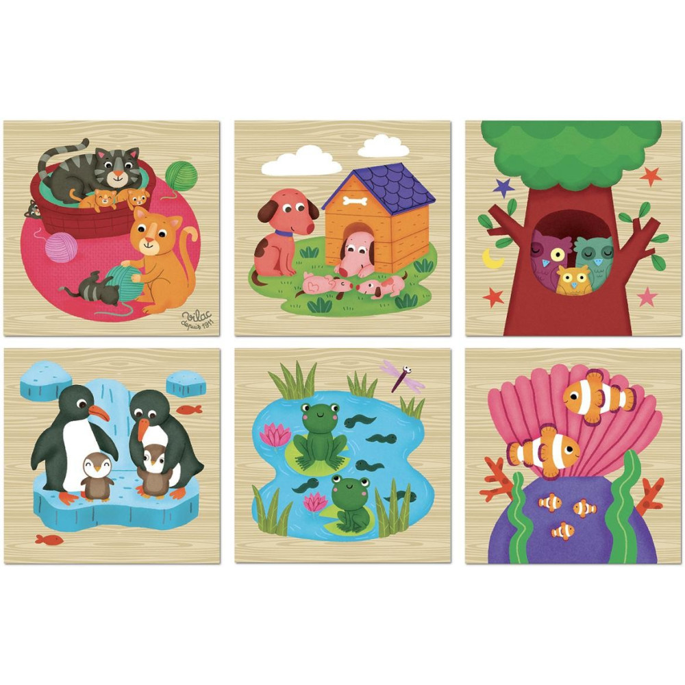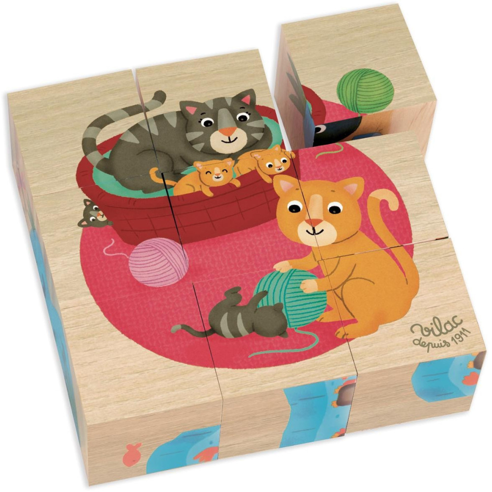 Devět dřevěných kostek s ilustracemi, z kterých je možno postavit šest velkých obrázků se zvířátky. Hračky Vilac mají značku francouzské agentury ADEME, to znamená, že tyto dřevěné hračky jsou vyráběny ekologicky. Šetří životní prostředí, neznečišťují půdu, vodu a vzduch, neplýtvají energiemi.