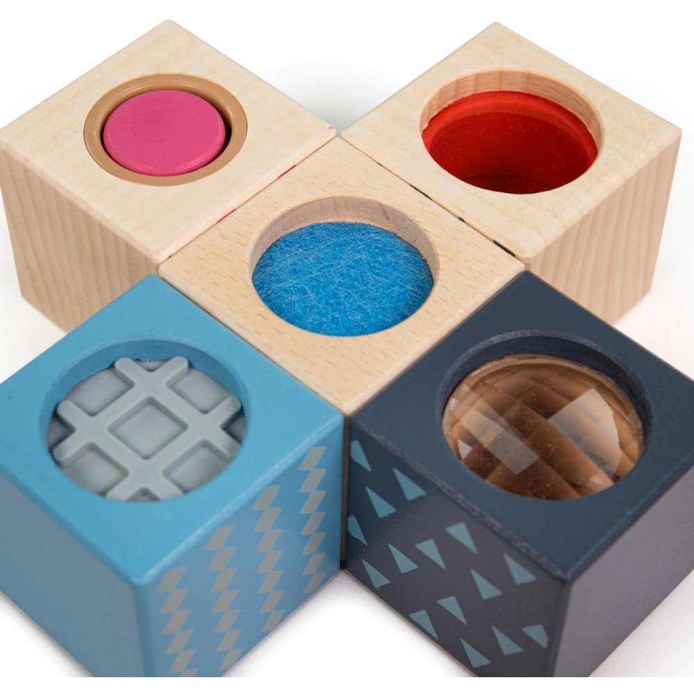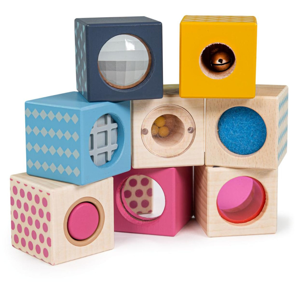 Nechejte děti prozkoumat roztodivné vlastnosti kostek a přitom tříbit své smysly. Atrakce v kostkách pomáhají stimulovat zejména hmat, ale také zrak a sluch. Zahrnují jak rozmanité materiály a povrchy, tak rolničku, pískací váleček, chrastítko, kukátko, optický hranol nebo zrcátko. Jsou ošetřeny nezávadnými barvami i laky, a nemusíte proto mít obavy, když je bude Vaše dítě zkoumat i dalšími smysly. Samozřejmě je lze využít také jako součást mnoha fantastických staveb. Při jejich výrobě byly použity vysoce kvalitní a odpovědně získané materiály, především certifikované dřevo z udržitelných zdrojů.
