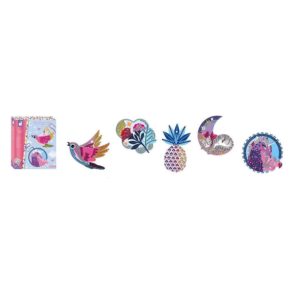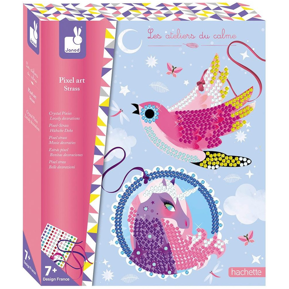 Sada Janod Atelier na tvorenie a podporu zručnosti a predstavivosti u detí. Kreatívne hračky pre deti nezaberajú veľa miesta, sú vhodné na cesty aj na doma, v zdraví aj chorobe a zabavia deti na dlhé hodiny. Tvorenie rôznymi technikami podporuje sústredenie a koncentráciu, prirodzené skúmanie a výtvarné schopnosti. Kreatívna sada Obrázky s flitrami na pripínanie Pixel obsahuje 5 kariet s krásnymi motívmi zvierat, 1500 mini kryštálikov v rôznych farbách a 5 stužiek. Pri tejto tvorivej hre si deti rozvíjajú jemnú motoriku, trpezlivosť a zmysel pre detail.Vhodné pre deti od 7 rokov