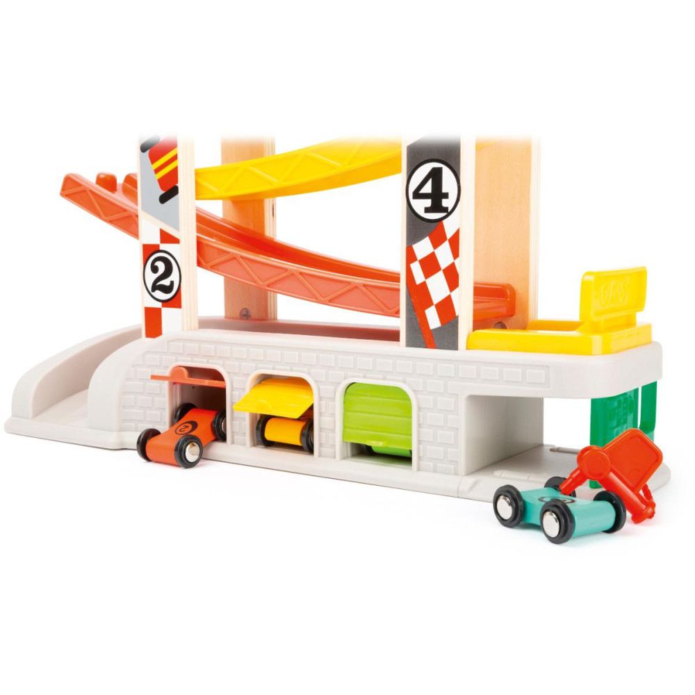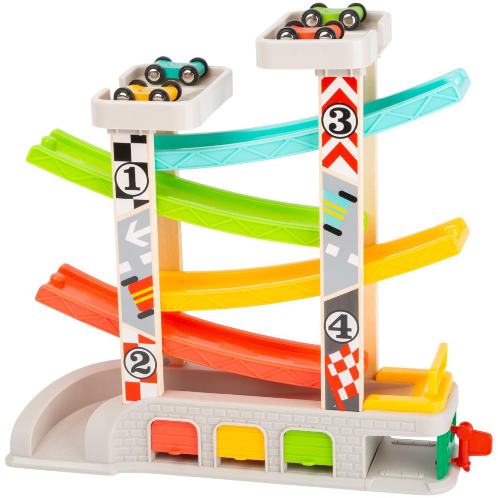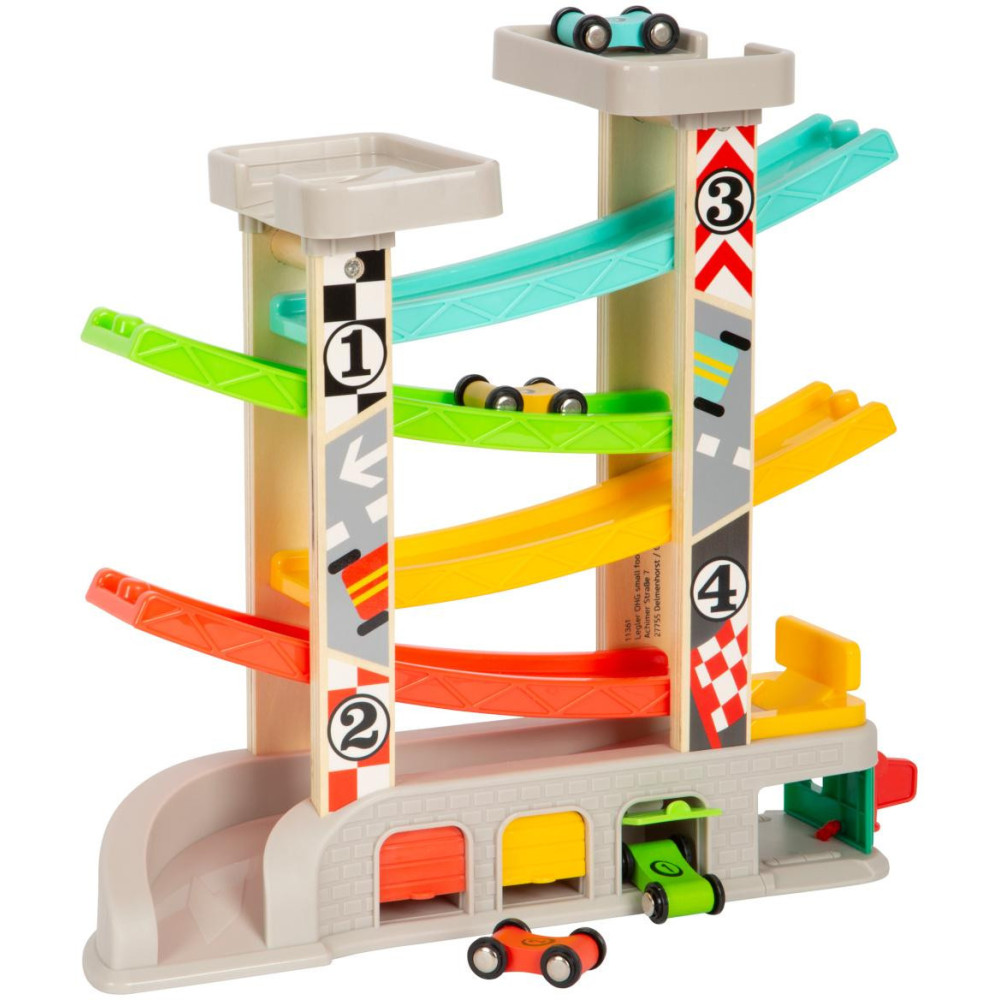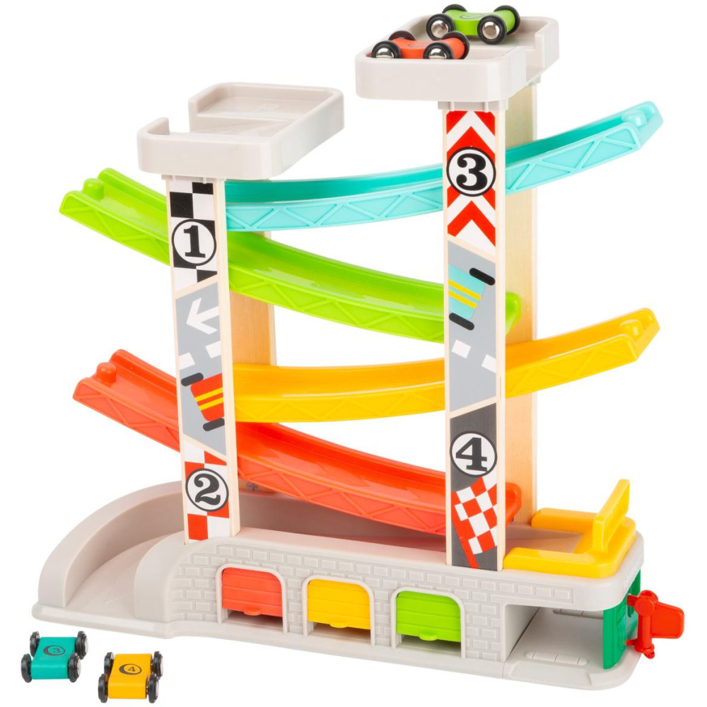 Prohánějte autíčka rychlostní kaskádou, jeden závodník může v těsném závěsu stíhat druhého v atmosféře plné napětí. Dráha je vybavena nejen dvojicí startovacích plošin, ale i zastávkou v boxech, díky které lze rozehrát hry rozvíjející dětskou představivost. U paty dráhy naleznete garáže s otevíratelnými dvířky, kde mohou autíčka odpočívat mezi závody a lze je prakticky využít k úklidu i přenášení hračky. Robustní a odolné provedení kombinuje plastové a atraktivně potištěné dřevěné díly. Díky své jedinečné barevnosti kaskáda snadno upoutá pozornost a podnítí dětskou zvědavost.