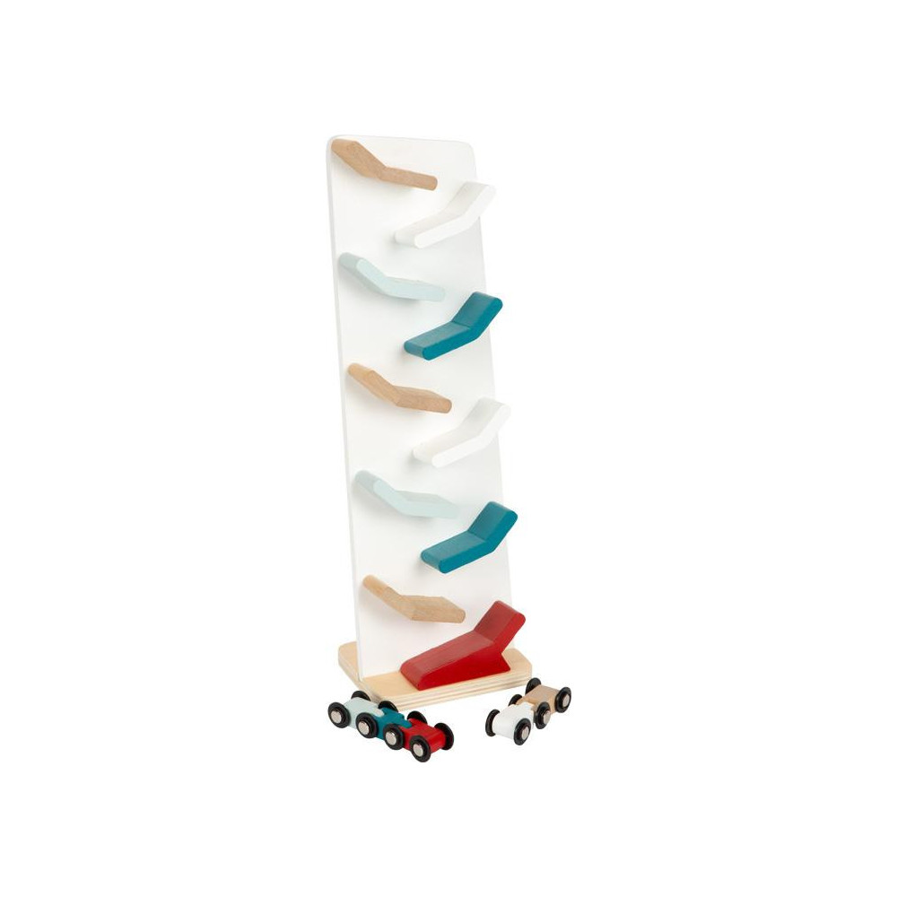 Tato kaskádová věž přitahuje pohledy každého! Při vypuštění pestrobarevných autíček shora se začnou řítit po různých úrovních dráhy. Vydávají zábavné klapavé zvuky a na závěr se rozjedou po podlaze. Je to uklidňující a zároveň fascinující dřevěná hračka! Díky moderním barvám v kombinaci s bílou a přírodním dřevem je sada také skvělou dekorací!
