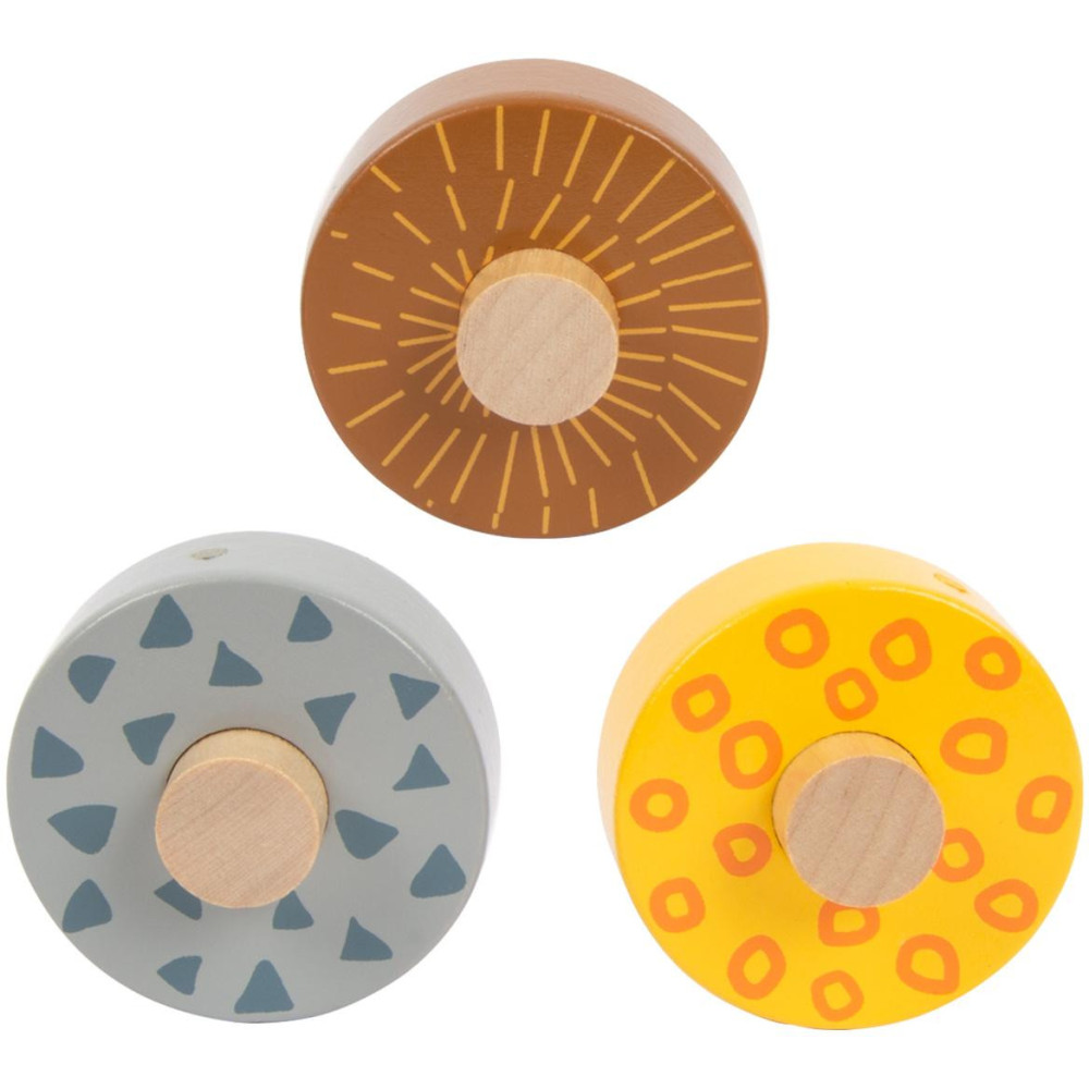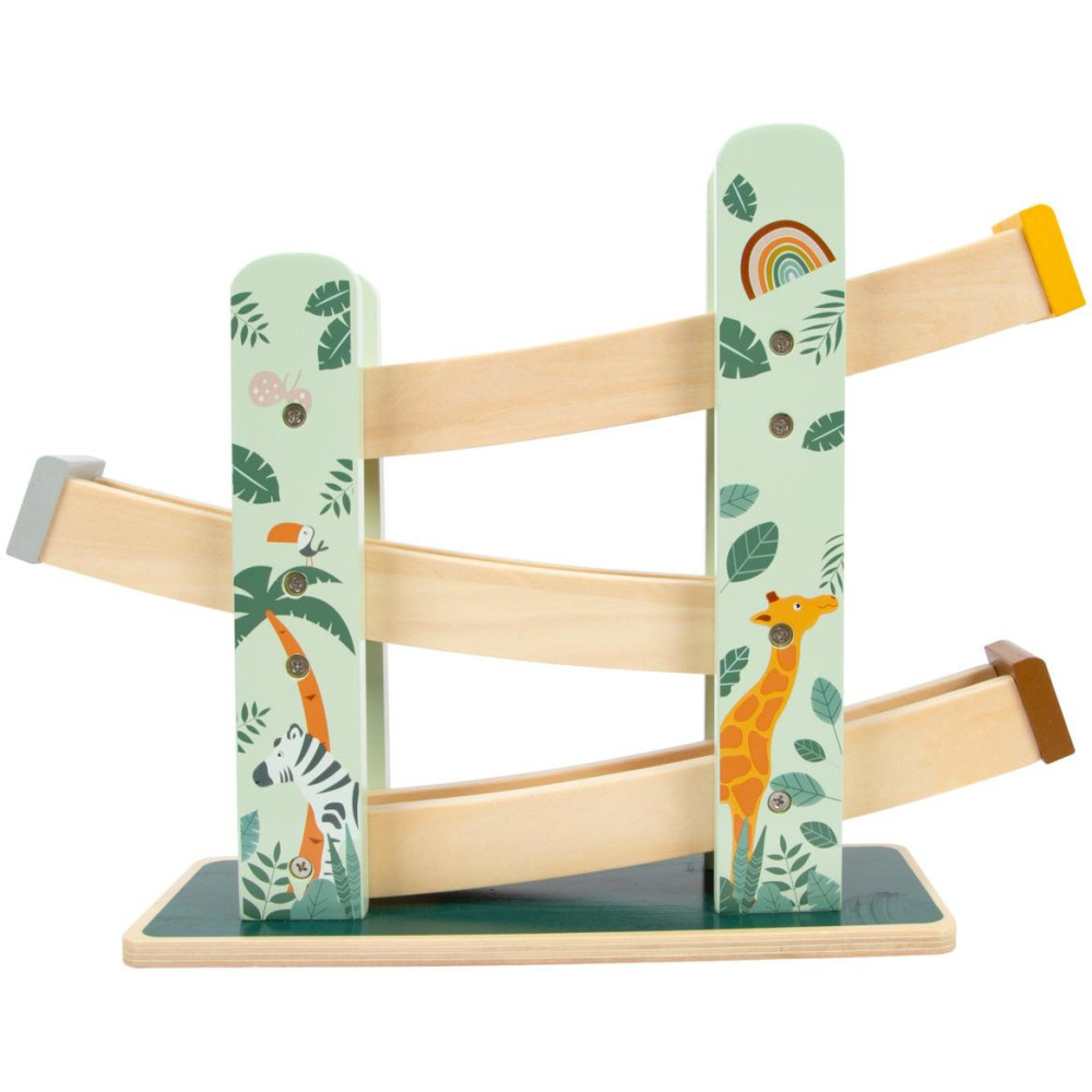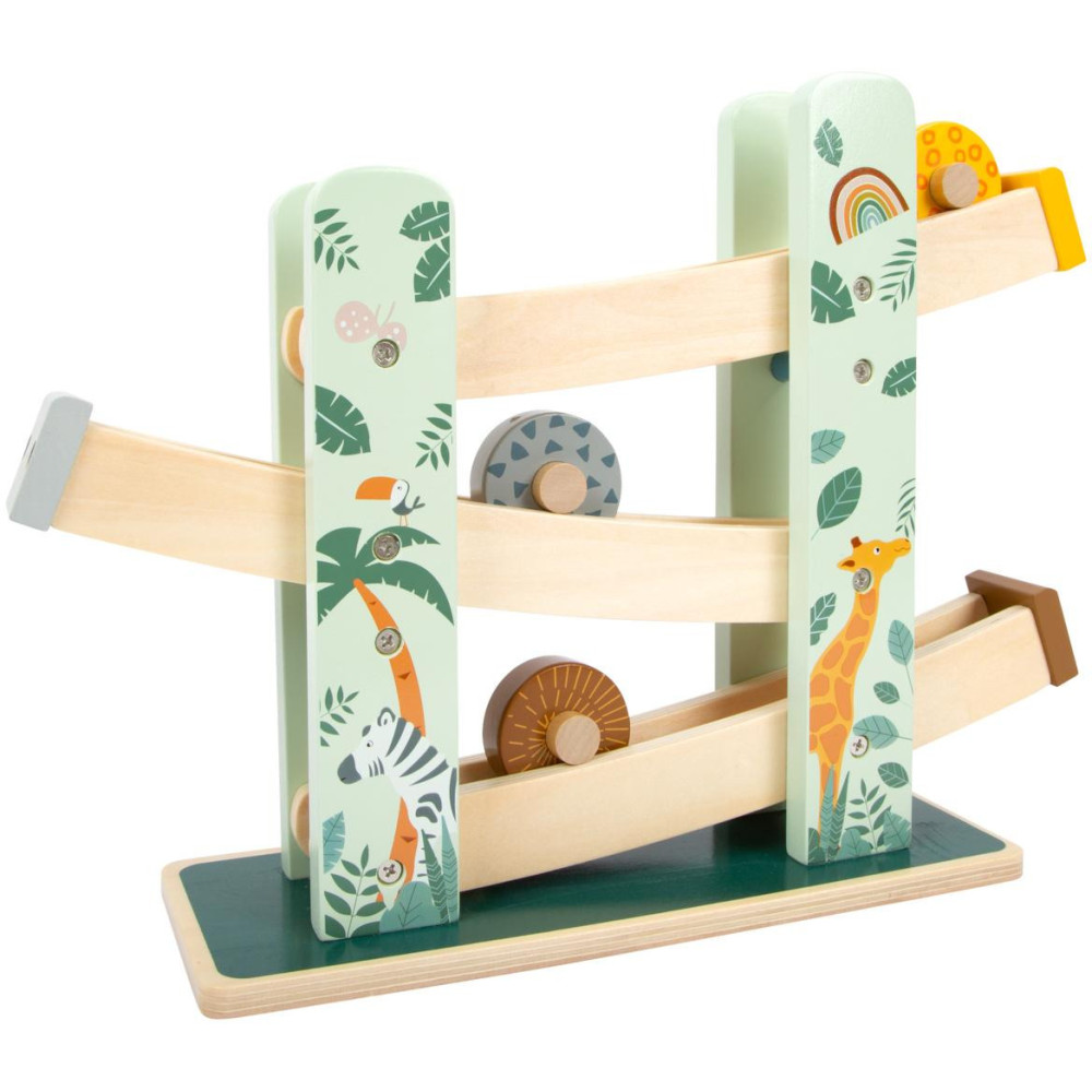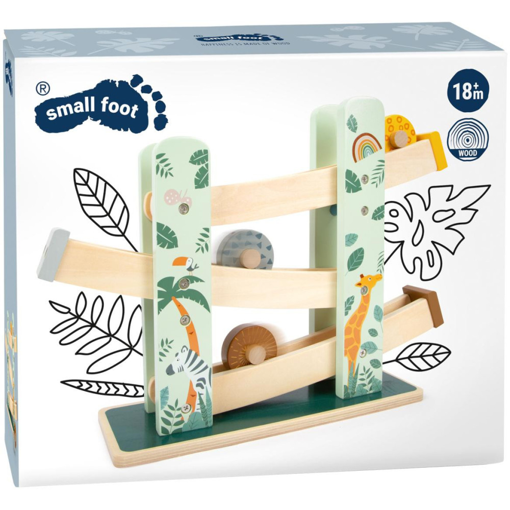Kutálejí se přírodou, nabírají rychlost. Tři dřevěná kolečka s rozdílnou ilustrací a vzory se kutálí dolů po třech rampách. Dráha je dekorována ilustracemi safari zvířat a rostlin z džungle. Krásná hračka, která slibuje dlouhotrvající zábavu.