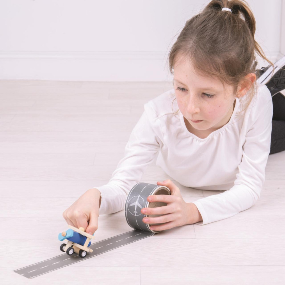 Snadno použitelná vzletová a přistávací dráha. Stačí ji odlepit a přilepit na libovolné místo. Součástí pásky je také dřevěné letadlo.