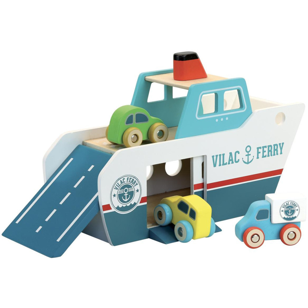 Vzhůru na palubu! Naloďte včas všechna autíčka a překonejte trajektem řeku, nebo moře. Loď je vybavena posuvnými dveřmi, za kterými se ukrývá prostorné podpalubí s parkovištěm. S pomocí sklápěcí rampy lze pak řidičům zpřístupnit i horní palubu. Součástí balení je hned několik různých autíček, která mohou děti bezprostředně přepravovat. Hračka vyniká vybranou barevností, díky které vkusně doplní interiér dětského pokojíčku. Neváhejte a doplňte ji dále o Malou garáž Vilacity, se kterou tvoří harmonickou kolekci. Vyrobeno z odolného masivního dřeva a silné překližky.