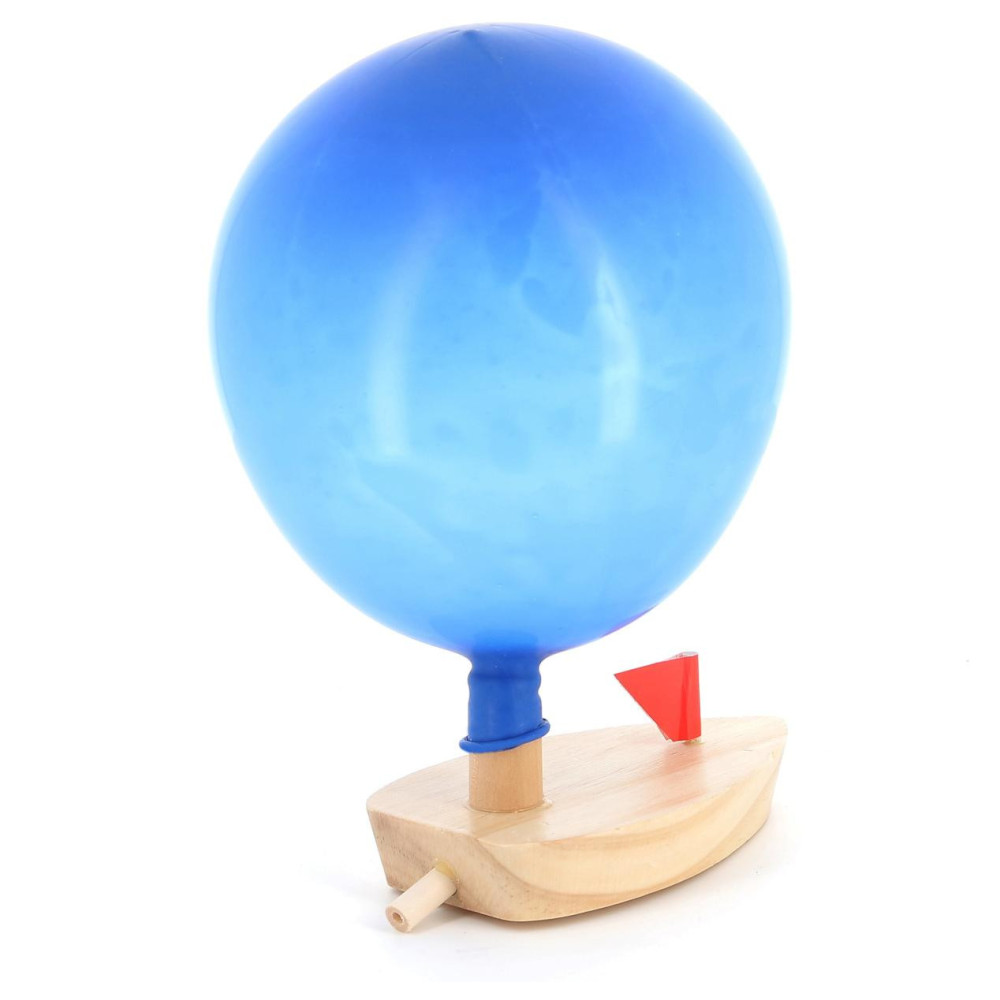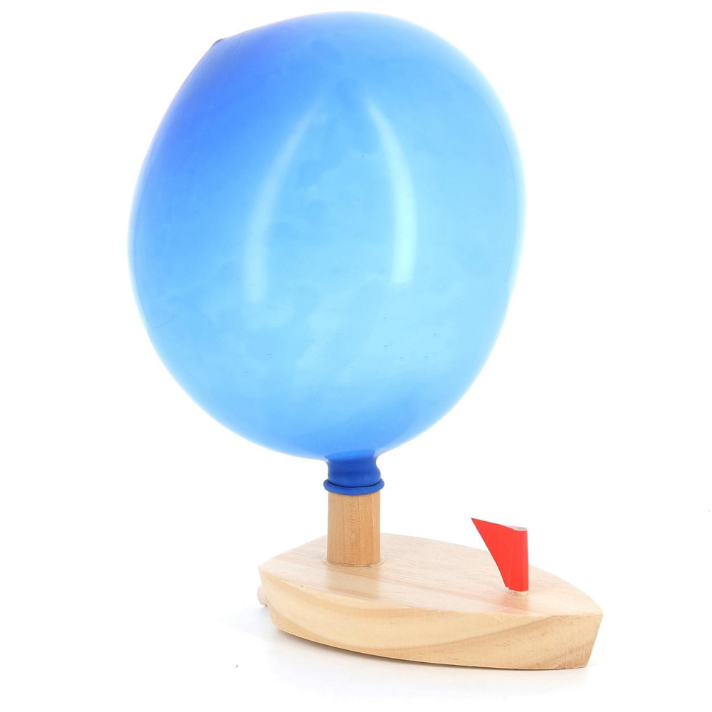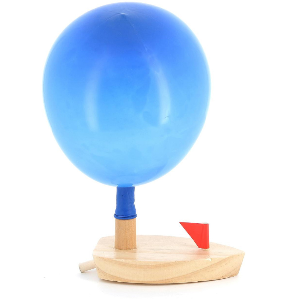 Při vypouštění vzduchu z balónku se dřevěná loďka pohybuje vpřed.